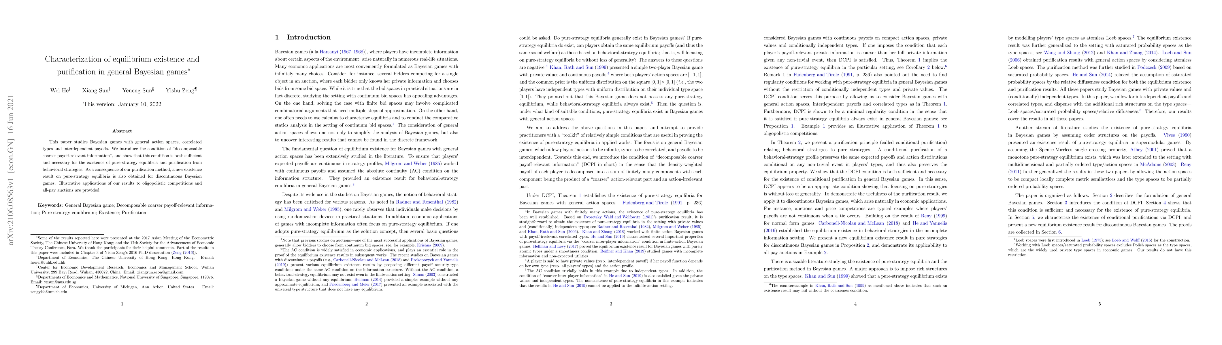 A new condition is introduced for Bayesian games to ensure existence of pure-strategy equilibria and purification from behavioral strategies, with implications for oligopolistic competitions and auctions.