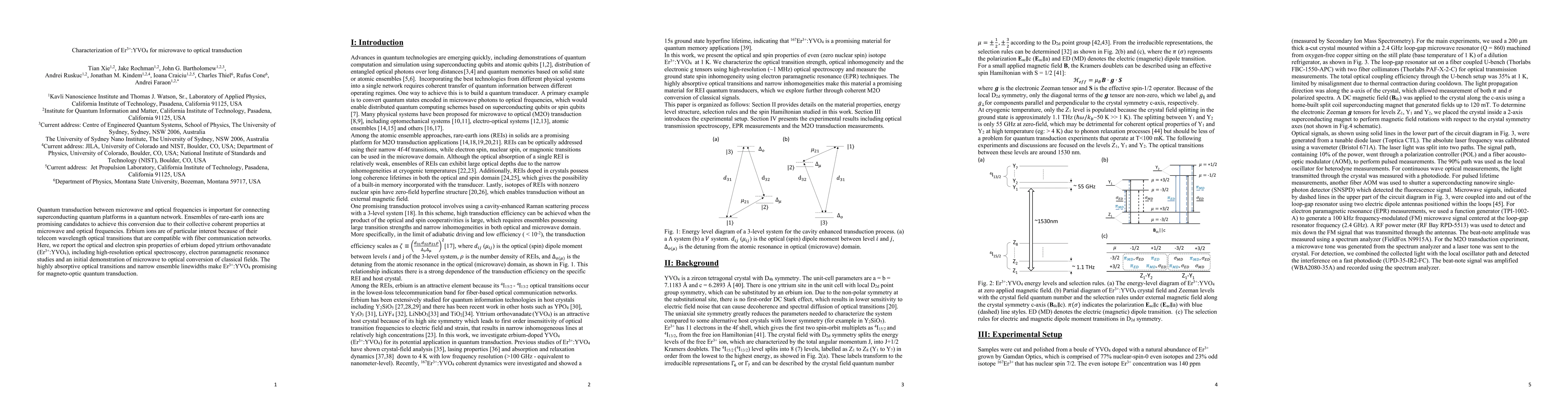 This study characterizes erbium-doped yttrium orthovanadate (Er$^{3+}$:YVO$_{4}$) for microwave to optical frequency transduction, showing its potential for quantum network connections through high-resolution spectroscopy and electron paramagnetic resonance, along with a preliminary demonstration of classical field conversion.