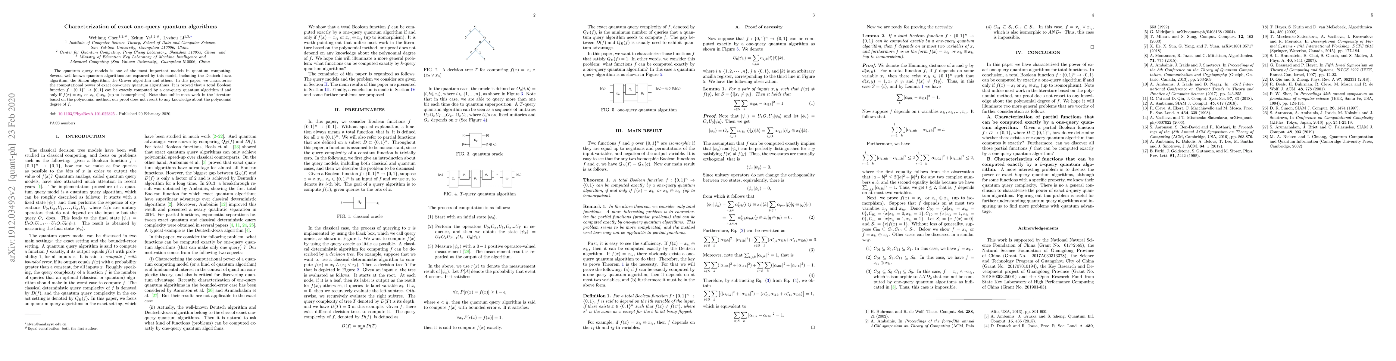 This paper characterizes the computational power of exact one-query quantum algorithms, proving that such algorithms can compute a total Boolean function if and only if the function is of the form $f(x)=x_{i_1}$ or $x_{i_1} \oplus x_{i_2}$, without relying on polynomial degree knowledge.