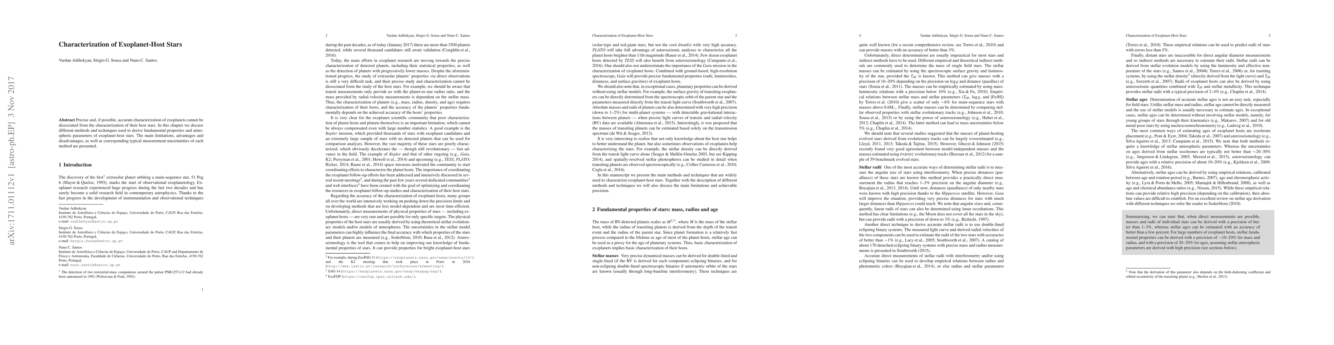 Precise and, if possible, accurate characterization of exoplanets cannot be dissociated from the characterization of their host stars. In this chapter we discuss different methods and techniques used to derive fundamental properties and atmospheric parameters of exoplanet-host stars. The main limitations, advantages and disadvantages, as well as corresponding typical measurement uncertainties of each method are presented.