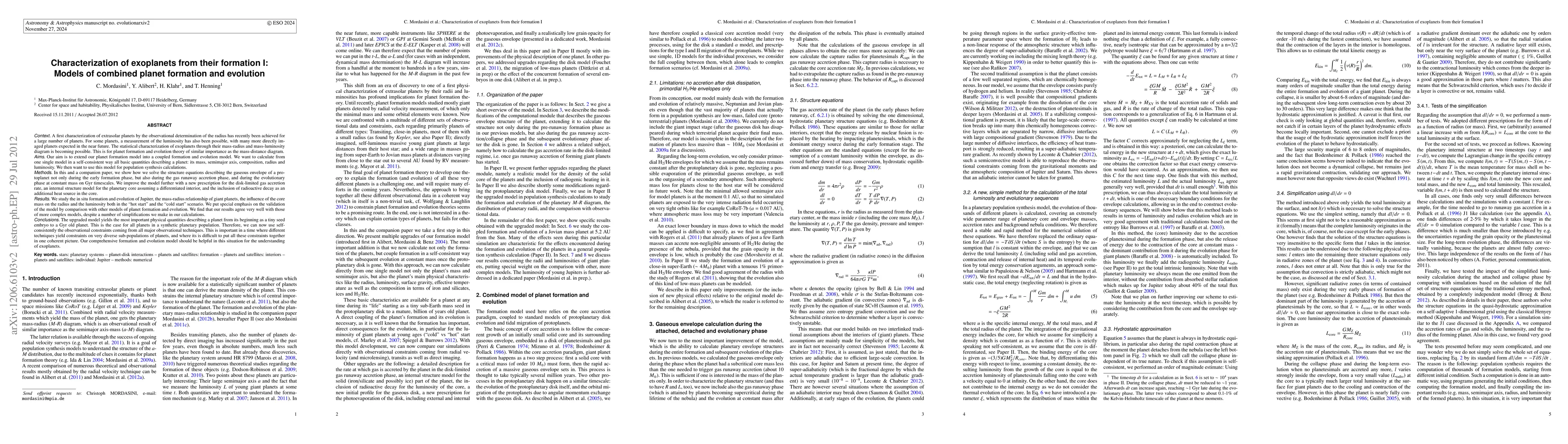 A first characterization of many exoplanets has recently been achieved by the observational determination of their radius. For some planets, a measurement of the luminosity has also been possible, with many more directly imaged planets expected in the future. The statistical characterization of exoplanets through their mass-radius and mass-luminosity diagram is thus becoming possible. This is for planet formation and evolution theory of similar importance as the mass-distance diagram. Our aim in this and a companion paper is to extend our formation model into a coupled formation and evolution model. We want to calculate in a self-consistent way all basic characteristics (M,a,R,L) of a planet and use the model for population synthesis calculations. Here we show how we solve the structure equations describing the gaseous envelope not only during the early formation phase, but also during gas runaway accretion, and during the evolutionary phase at constant mass on Gyr timescales. We then study the in situ formation and evolution of Jupiter, the mass-radius relationship of giants, the influence of the core mass on the radius and the luminosity both in the "hot start" and the "cold start" scenario. We put special emphasis on the comparison with other models. We find that our results agree very well with those of more complex models, despite a number of simplifications. The upgraded model yields the most important characteristics of a planet from its beginning as a seed embryo to a Gyr old planet. This is the case for all planets in a synthetic planetary population. Therefore, we can now use self-consistently the statistical constraints coming from all major observational techniques. This is important in a time where different techniques yield constraints on very diverse sub-populations of planets, and where its is challenging to put all these constraints together in one coherent picture.