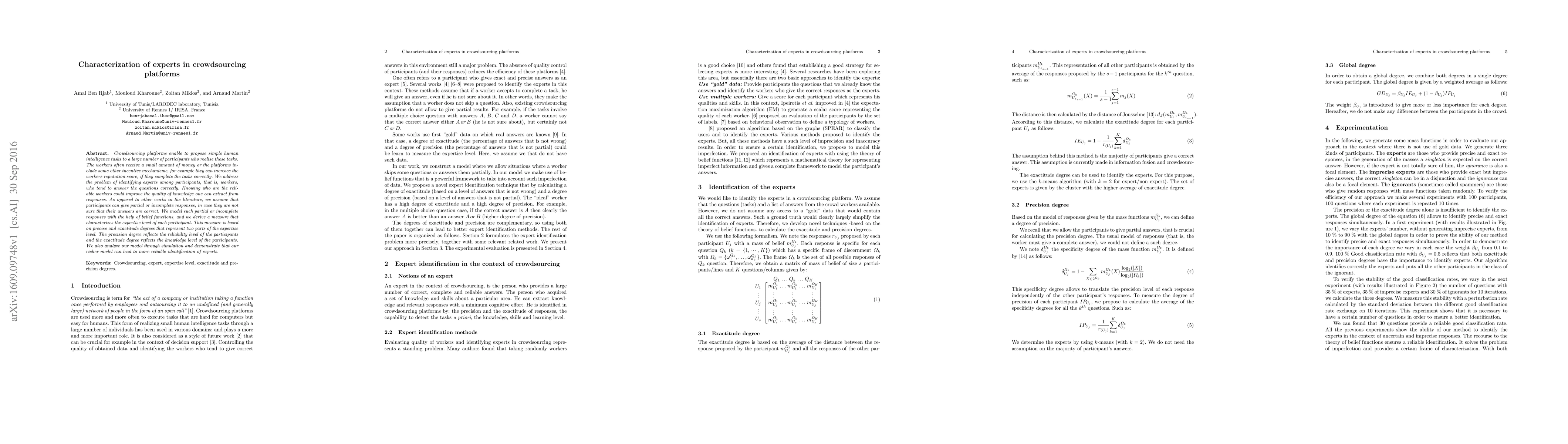 This paper proposes a method to identify expert workers on crowdsourcing platforms by evaluating their reliability and knowledge levels. It introduces a measure based on precision and exactitude degrees, modeled using belief functions to account for partial responses, and demonstrates through simulation that this approach can more accurately identify reliable experts.