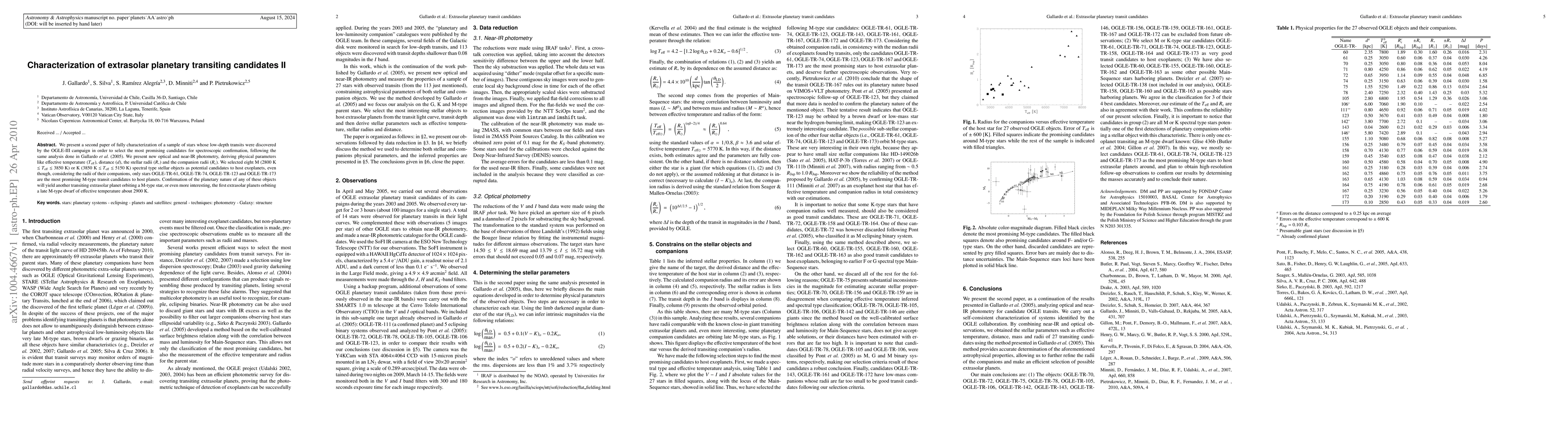 We present a second paper of fully characterization of a sample of stars whose low-depth transits were discovered by the OGLE-III campaign in order to select the most promising candidates for spectroscopic confirmation, following the same analysis done in Gallardo et al. (2005). We present new optical and near-IR photometry, deriving physical parameters like effective temperature (Teff), distance (d), the stellar radii (R*) and the companion radii (Rc). We selected eight M (2800 K \le Teff \le 3850 K) or K (3850 K \le Teff \le 5150 K) spectral type stellar objects as potential candidates to host exoplanets, even though, considering the radii of their companions, only stars OGLE-TR-61, OGLE-TR-74, OGLE-TR-123 and OGLE-TR-173 are the most promising M-type transit candidates to host planets. Confirmation of the planetary nature of any of these objects will yield another transiting extrasolar planet orbiting a M-type star, or even more interesting, the first extrasolar planets orbiting a late M-type dwarf of effective temperature about 2900 K.
