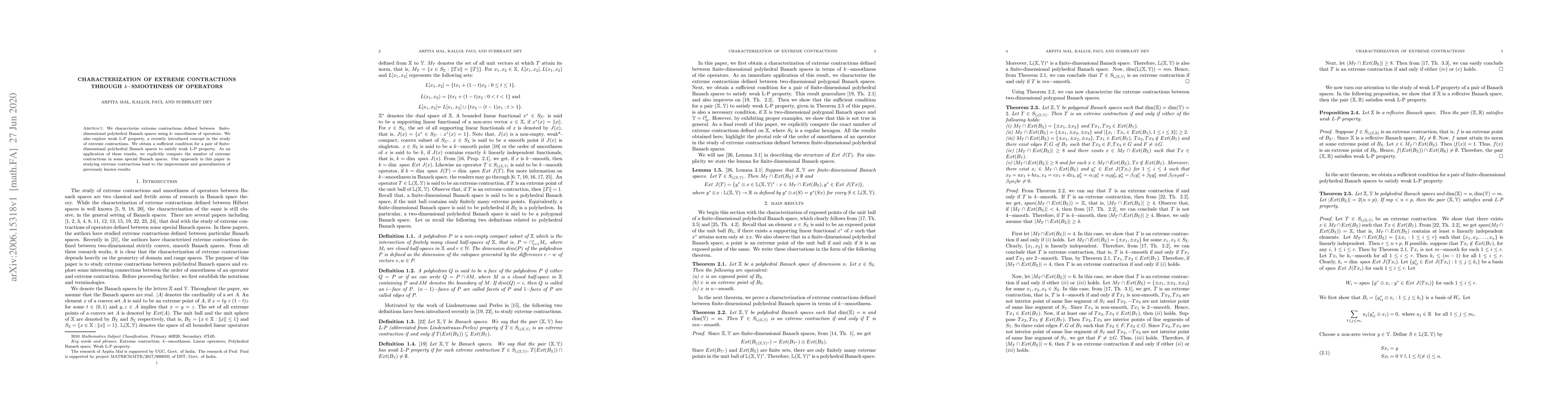 We characrterize extreme contractions defined between \ finite-dimensional polyhedral Banach spaces using $k$- smoothness of operators. We also explore weak L-P property, a recently introduced concept in the study of extreme contractions. We obtain a sufficient condition for a pair of finite-dimensional polyhedral Banach spaces to satisfy weak L-P property. As an application of these results, we explicitly compute the number of extreme contractions in some special Banach spaces. Our approach in this paper in studying extreme contractions lead to the improvement and generalization of previously known results.