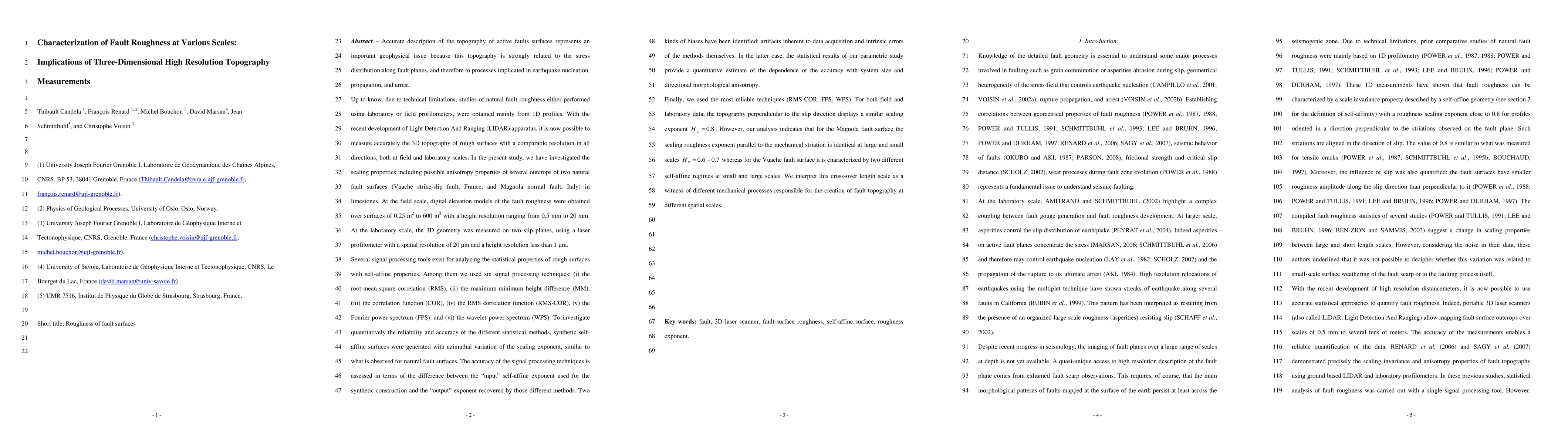 This study uses high-resolution 3D LIDAR topography to characterize fault roughness at various scales, examining the Vuache strike-slip fault in France and the Magnola normal fault in Italy. The findings reveal scaling properties and potential anisotropy, crucial for understanding stress distribution and earthquake dynamics.