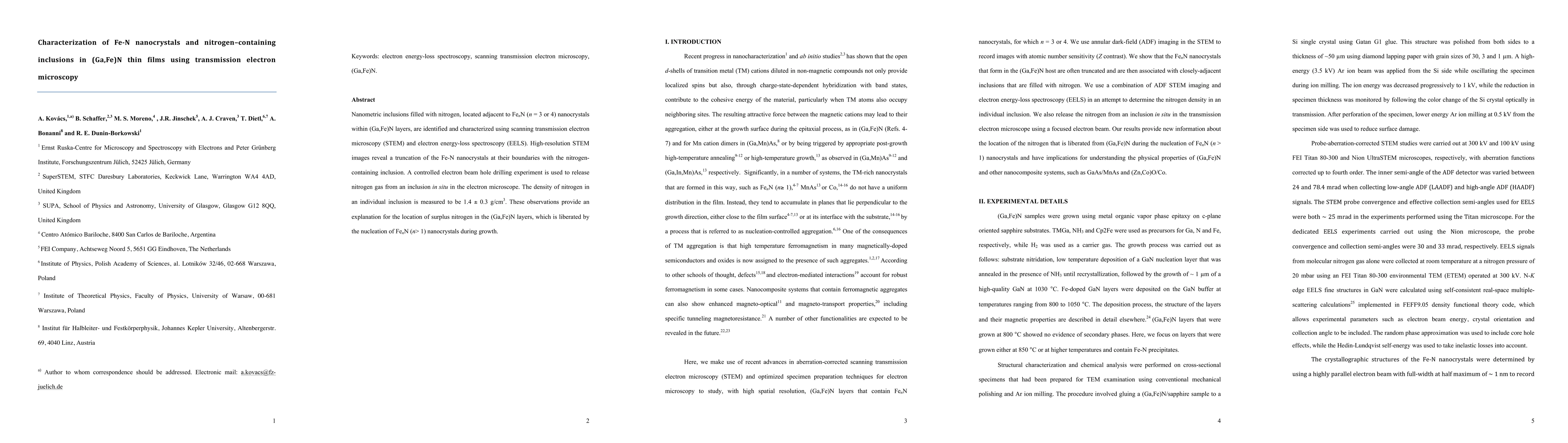 This paper characterizes Fe-N nanocrystals and nitrogen-containing inclusions in (Ga,Fe)N thin films using STEM and EELS, revealing the truncation of Fe-N nanocrystals at inclusion boundaries and measuring the nitrogen density in inclusions to be 1.4 ± 0.3 g/cm³, explaining the surplus nitrogen's location in the layers.