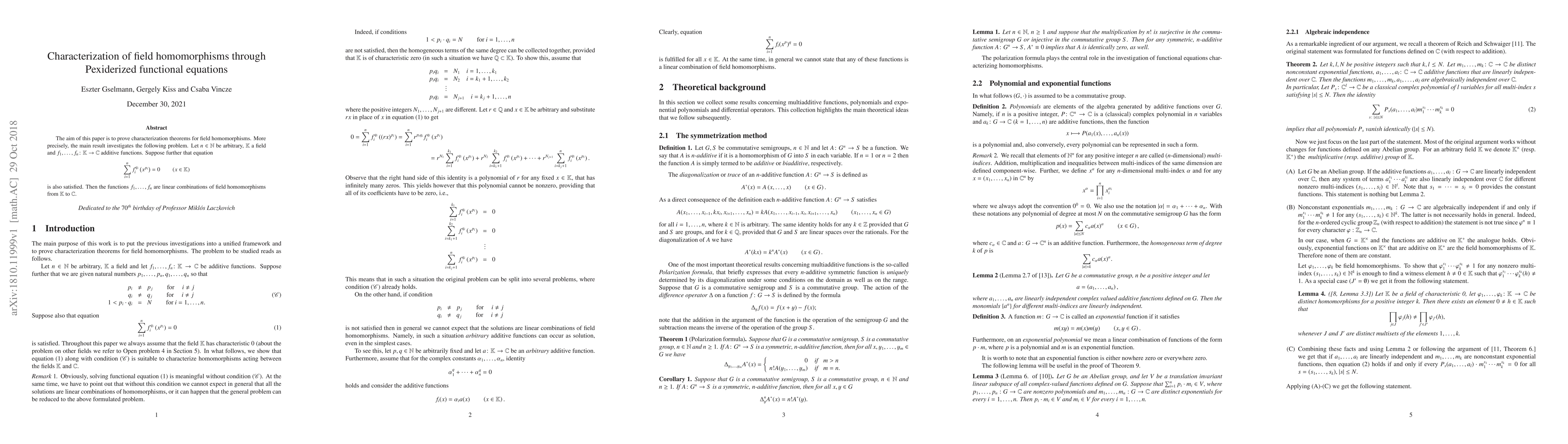 The aim of this paper is to prove characterization theorems for field homomorphisms. More precisely, the main result investigates the following problem. Let $n\in \mathbb{N}$ be arbitrary, $\mathbb{K}$ a field and $f_{1}, \ldots, f_{n}\colon \mathbb{K}\to \mathbb{C}$ additive functions. Suppose further that equation \[ \sum_{i=1}^{n}f^{q_{i}}_{i}\left(x^{p_{i}}\right)=0 \qquad \left(x\in \mathbb{K}\right) \] is also satisfied. Then the functions $f_{1}, \ldots, f_{n}$ are linear combinations of field homomorphisms from $\mathbb{K}$ to $\mathbb{C}$.