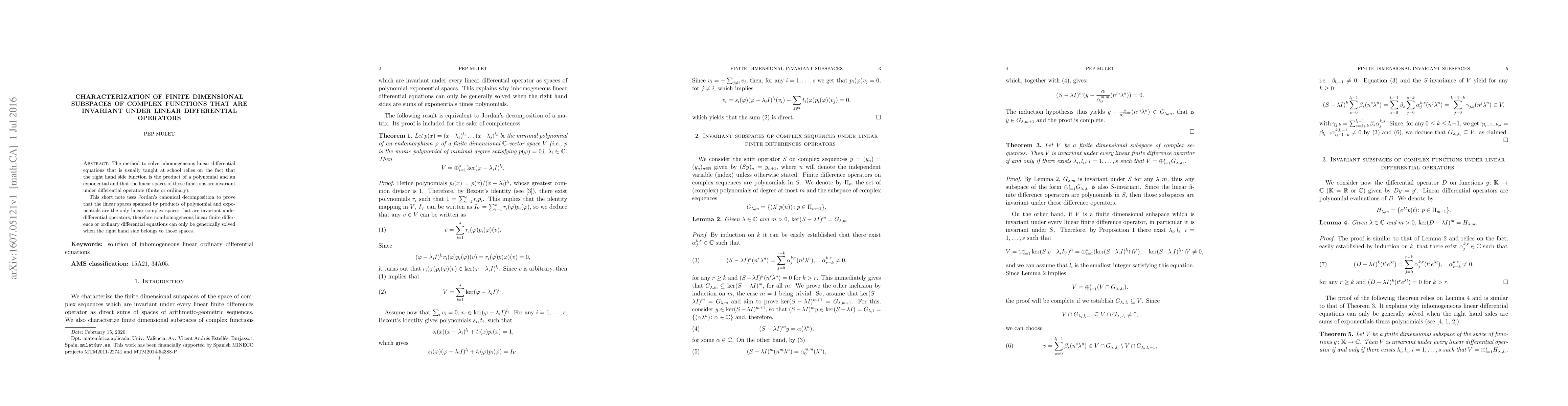 The method to solve inhomogeneous linear differential equations that is usually taught at school relies on the fact that the right hand side function is the product of a polynomial and an exponential and that the linear spaces of those functions are invariant under differential operators (finite or ordinary). This short note uses Jordan's canonical decomposition to prove that the linear spaces spanned by products of polynomial and exponentials are the only linear complex spaces that are invariant under differential operators, therefore non-homogeneous linear finite difference or ordinary differential equations can only be generically solved when the right hand side belongs to those spaces.