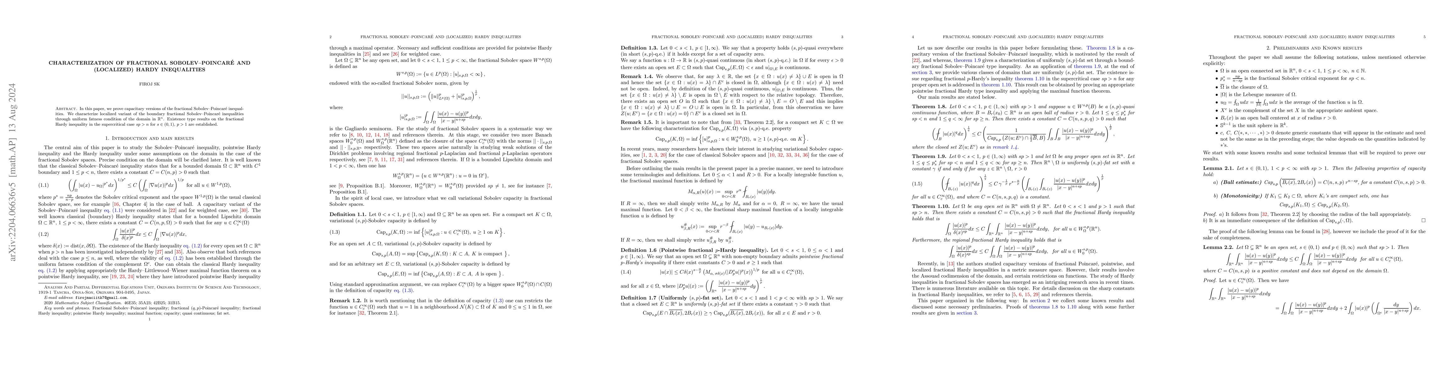 This paper proves capacitary versions of fractional Sobolev-Poincaré inequalities and characterizes localized variants via uniform fatness conditions. It also establishes existence results for fractional Hardy inequalities in the supercritical case and characterizes the fractional Hardy inequality through weak supersolutions.