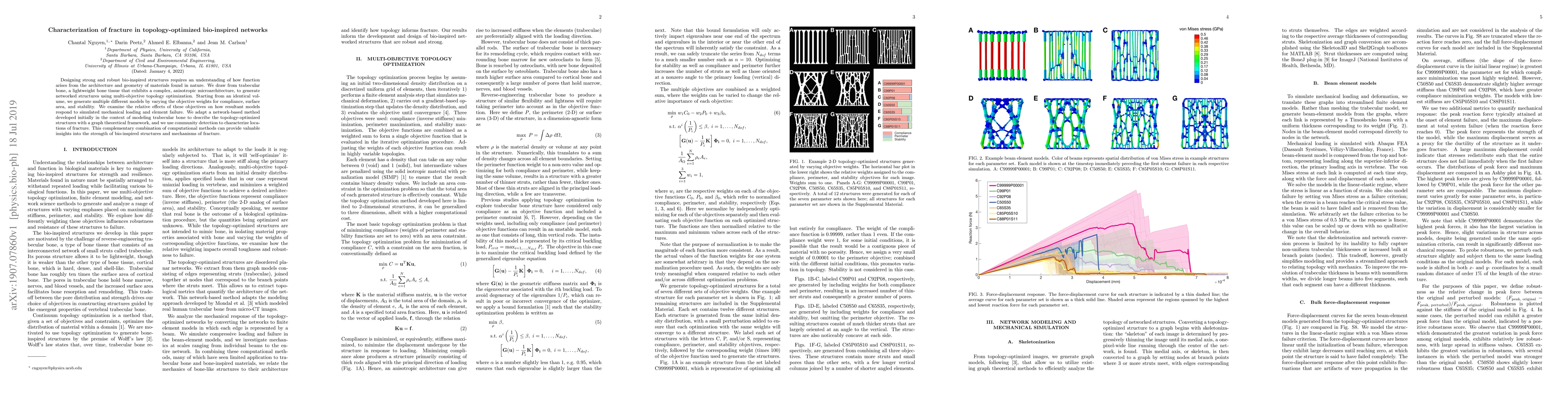 Designing strong and robust bio-inspired structures requires an understanding of how function arises from the architecture and geometry of materials found in nature. We draw from trabecular bone, a lightweight bone tissue that exhibits a complex, anisotropic microarchitecture, to generate networked structures using multi-objective topology optimization. Starting from an identical volume, we generate multiple different models by varying the objective weights for compliance, surface area, and stability. We examine the relative effects of these objectives on how resultant models respond to simulated mechanical loading and element failure. We adapt a network-based method developed initially in the context of modeling trabecular bone to describe the topology-optimized structures with a graph theoretical framework, and we use community detection to characterize locations of fracture. This complementary combination of computational methods can provide valuable insights into the strength of bio-inspired structures and mechanisms of fracture.