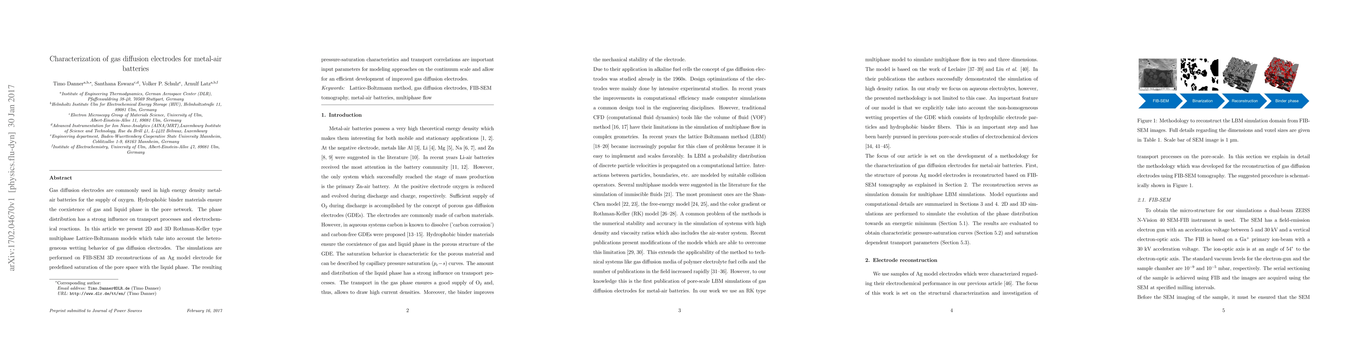 This paper characterizes gas diffusion electrodes used in metal-air batteries through 2D and 3D multiphase Lattice-Boltzmann models, simulating the heterogeneous wetting behavior and phase distribution. The study uses FIB-SEM 3D reconstructions of an Ag model electrode to derive pressure-saturation characteristics and transport correlations, aiding in the development of better gas diffusion electrodes.