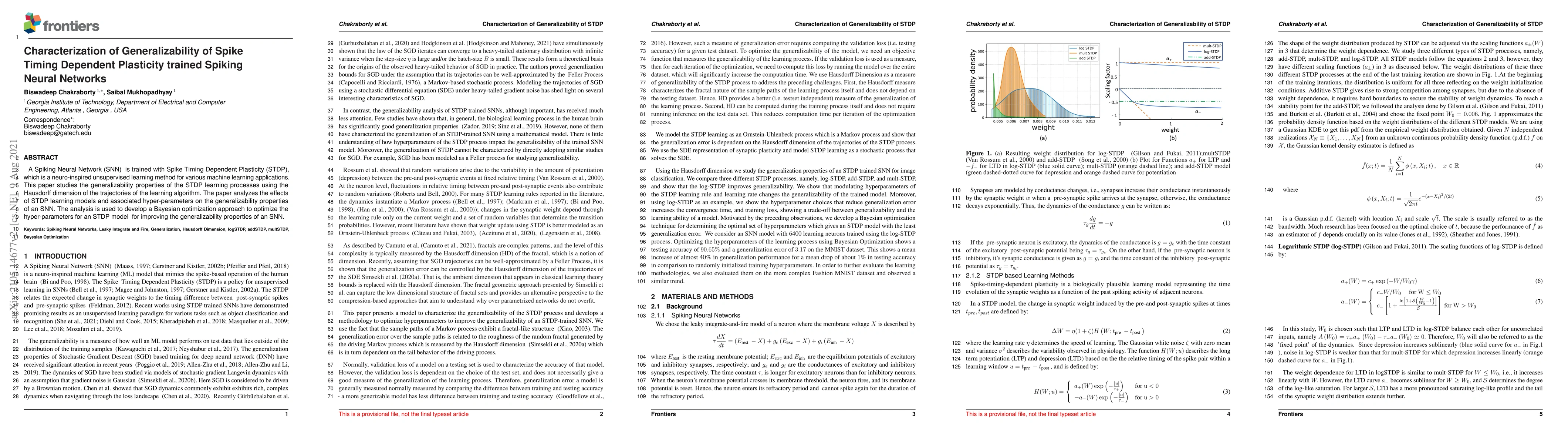 A Spiking Neural Network (SNN) is trained with Spike Timing Dependent Plasticity (STDP), which is a neuro-inspired unsupervised learning method for various machine learning applications. This paper studies the generalizability properties of the STDP learning processes using the Hausdorff dimension of the trajectories of the learning algorithm. The paper analyzes the effects of STDP learning models and associated hyper-parameters on the generalizability properties of an SNN. The analysis is used to develop a Bayesian optimization approach to optimize the hyper-parameters for an STDP model for improving the generalizability properties of an SNN.