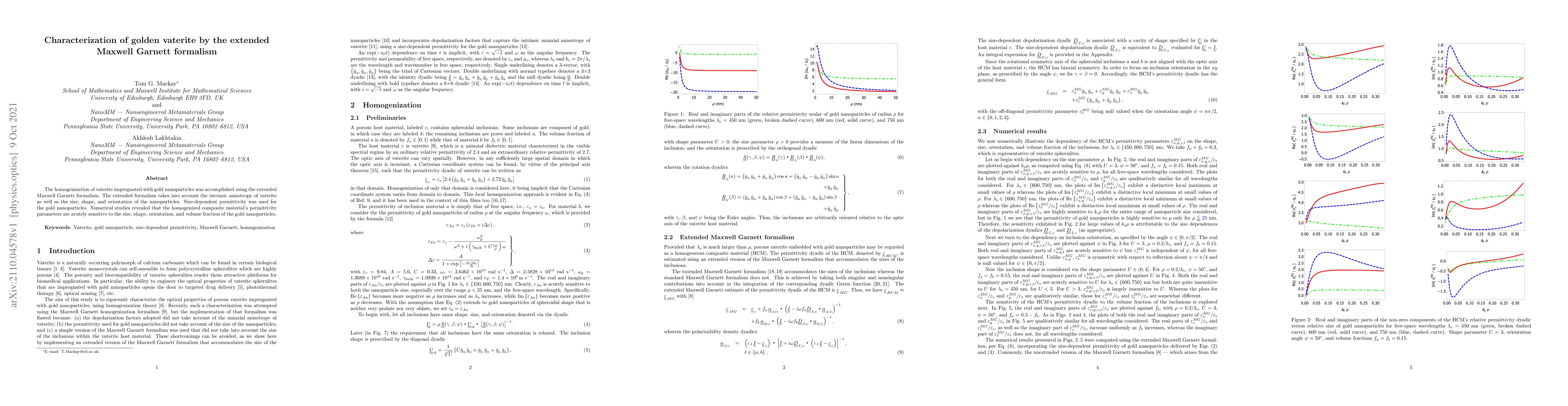 The homogenization of vaterite impregnated with gold nanoparticles was accomplished using the extended Maxwell Garnett formalism. The extended formalism takes into account the intrinsic anisotropy of vaterite as well as the size, shape, and orientation of the nanoparticles. Size-dependent permittivity was used for the gold nanoparticles. Numerical studies revealed that the homogenized composite material's permittivity parameters are acutely sensitive to the size, shape, orientation, and volume fraction of the gold nanoparticles.