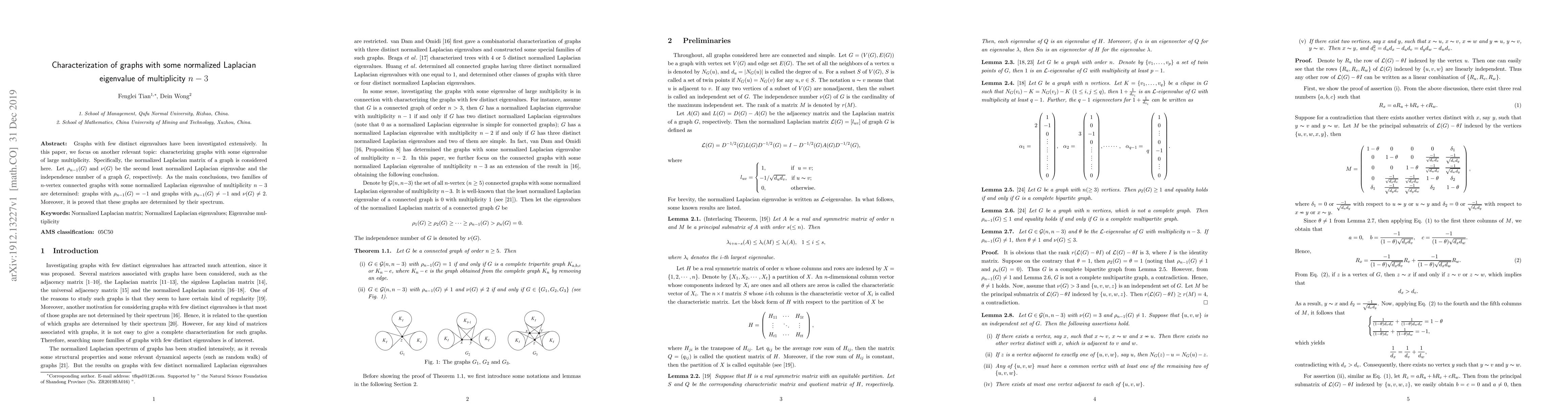 This paper characterizes $n$-vertex connected graphs where a normalized Laplacian eigenvalue has multiplicity $n-3$. It determines two families of such graphs: those with the second least eigenvalue $\rho_{n-1}(G)=-1$ and those with $\rho_{n-1}(G)\neq -1$ and independence number $\nu(G)\neq 2$, proving that these graphs are uniquely determined by their spectra.