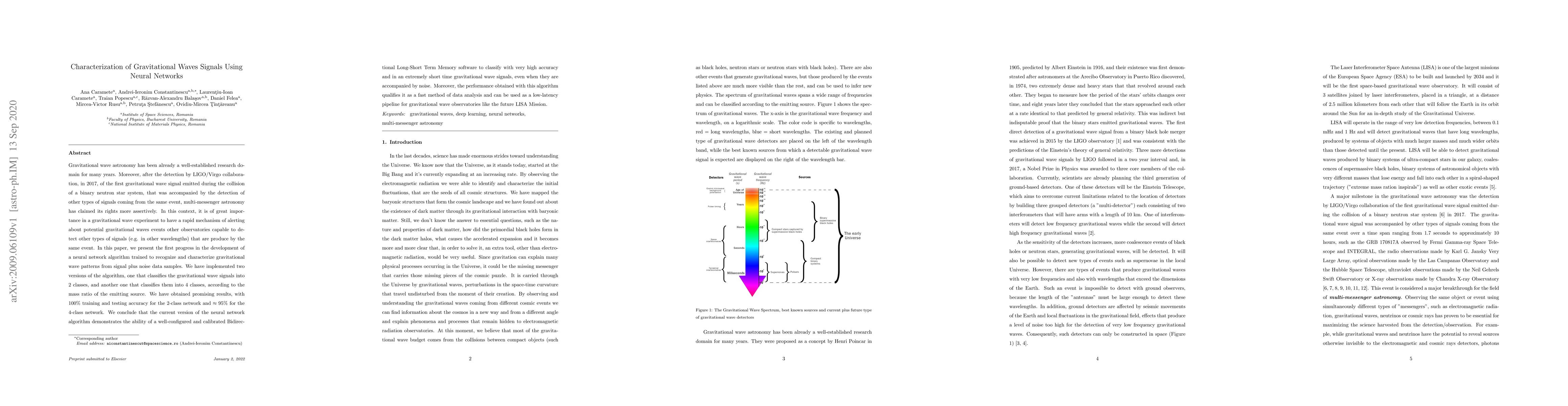 Gravitational wave astronomy has been already a well-established research domain for many years. Moreover, after the detection by LIGO/Virgo collaboration, in 2017, of the first gravitational wave signal emitted during the collision of a binary neutron star system, that was accompanied by the detection of other types of signals coming from the same event, multi-messenger astronomy has claimed its rights more assertively. In this context, it is of great importance in a gravitational wave experiment to have a rapid mechanism of alerting about potential gravitational waves events other observatories capable to detect other types of signals (e.g. in other wavelengths) that are produce by the same event. In this paper, we present the first progress in the development of a neural network algorithm trained to recognize and characterize gravitational wave patterns from signal plus noise data samples. We have implemented two versions of the algorithm, one that classifies the gravitational wave signals into 2 classes, and another one that classifies them into 4 classes, according to the mass ratio of the emitting source. We have obtained promising results, with 100% training and testing accuracy for the 2-class network and approximately 95% for the 4-class network. We conclude that the current version of the neural network algorithm demonstrates the ability of a well-configured and calibrated Bidirectional Long-Short Term Memory software to classify with very high accuracy and in an extremely short time gravitational wave signals, even when they are accompanied by noise. Moreover, the performance obtained with this algorithm qualifies it as a fast method of data analysis and can be used as a low-latency pipeline for gravitational wave observatories like the future LISA Mission.