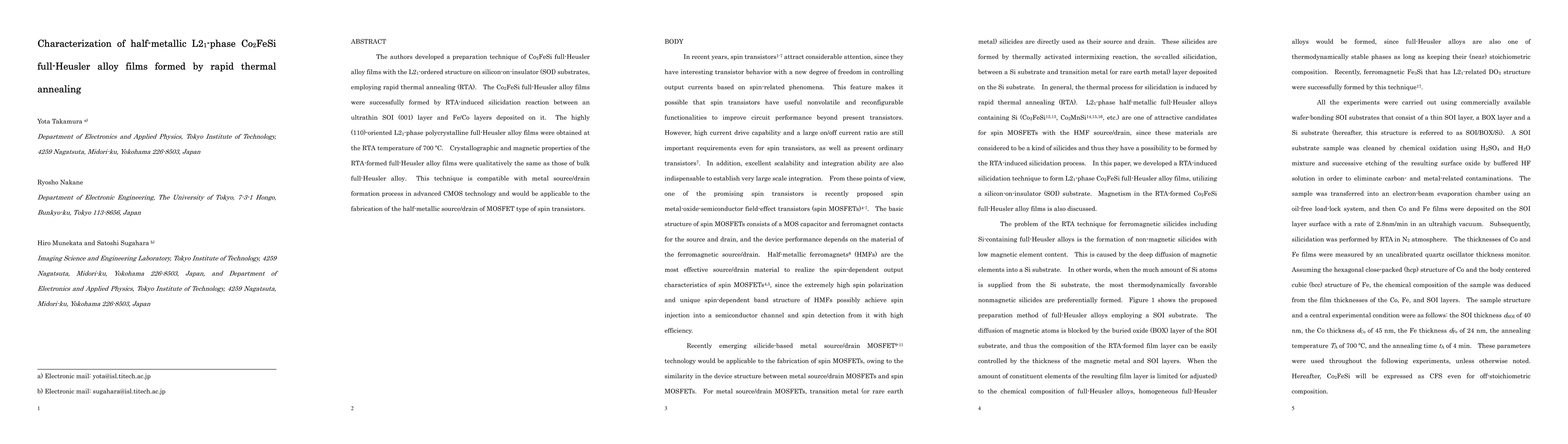 The study presents a method for forming highly (110)-oriented L2_1-phase Co_2FeSi full-Heusler alloy films on SOI substrates via rapid thermal annealing, achieving properties similar to bulk alloys, which could enable the fabrication of half-metallic source/drains for spin transistors in CMOS technology.