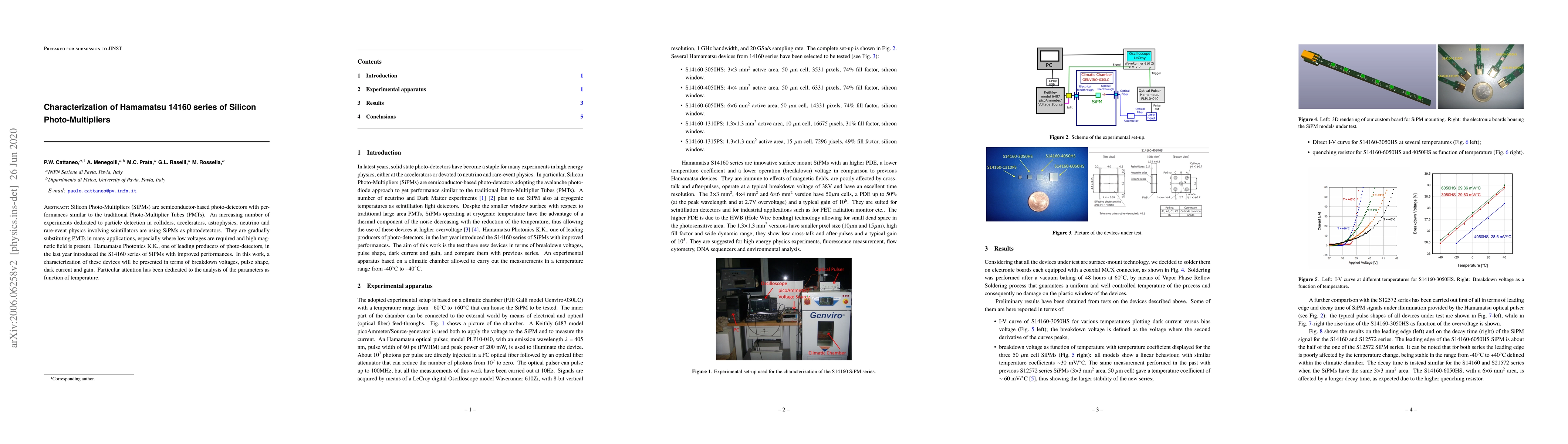 Silicon Photo-Multipliers (SiPMs) are semiconductor-based photo-detectors with performances similar to the traditional Photo-Multiplier Tubes (PMTs). An increasing number of experiments dedicated to particle detection in colliders, accelerators, astrophysics, neutrino and rare-event physics involving scintillators are using SiPMs as photodetectors. They are gradually substituting PMTs in many applications, especially where low voltages are required and high magnetic field is present. Hamamatsu Photonics K.K., one of leading producers of photo-detectors, in the last year introduced the S14160 series of SiPMs with improved performances. In this work, a characterization of these devices will be presented in terms of breakdown voltages, pulse shape, dark current and gain. Particular attention has been dedicated to the analysis of the parameters as function of temperature.
