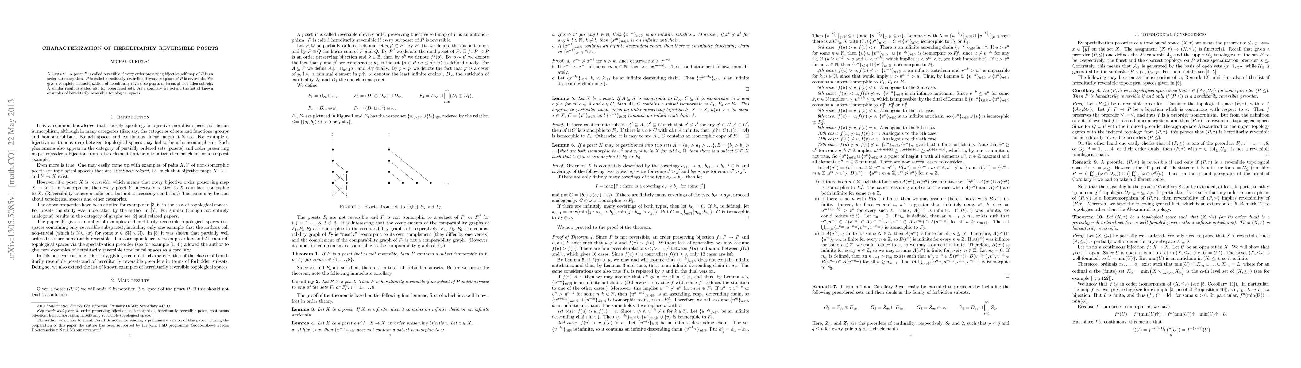 This paper provides a complete characterization of hereditarily reversible posets and preordered sets in terms of forbidden subsets, thereby extending the known examples of hereditarily reversible topological spaces.