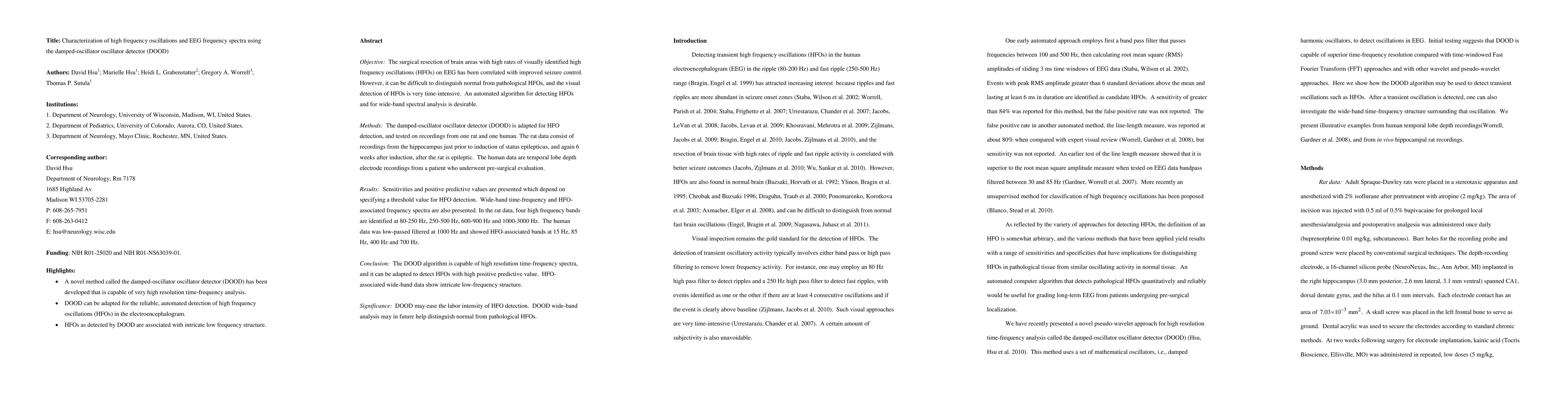 Objective: The surgical resection of brain areas with high rates of visually identified high frequency oscillations (HFOs) on EEG has been correlated with improved seizure control. However, it can be difficult to distinguish normal from pathological HFOs, and the visual detection of HFOs is very time-intensive. An automated algorithm for detecting HFOs and for wide-band spectral analysis is desirable. Methods: The damped-oscillator oscillator detector (DOOD) is adapted for HFO detection, and tested on recordings from one rat and one human. The rat data consist of recordings from the hippocampus just prior to induction of status epilepticus, and again 6 weeks after induction, after the rat is epileptic. The human data are temporal lobe depth electrode recordings from a patient who underwent pre-surgical evaluation. Results: Sensitivities and positive predictive values are presented which depend on specifying a threshold value for HFO detection. Wide-band time-frequency and HFO-associated frequency spectra are also presented. In the rat data, four high frequency bands are identified at 80-250 Hz, 250-500 Hz, 600-900 Hz and 1000-3000 Hz. The human data was low-passed filtered at 1000 Hz and showed HFO-associated bands at 15 Hz, 85 Hz, 400 Hz and 700 Hz. Conclusion: The DOOD algorithm is capable of high resolution time-frequency spectra, and it can be adapted to detect HFOs with high positive predictive value. HFO-associated wide-band data show intricate low-frequency structure. Significance: DOOD may ease the labor intensity of HFO detection. DOOD wide-band analysis may in future help distinguish normal from pathological HFOs.