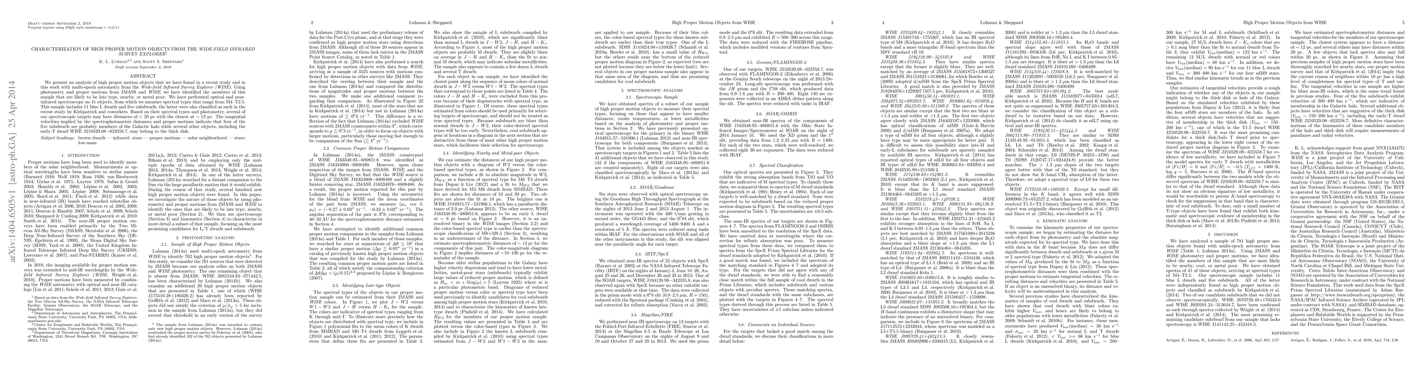 We present an analysis of high proper motion objects that we have found in a recent study and in this work with multi-epoch astrometry from the Wide-field Infrared Survey Explorer (WISE). Using photometry and proper motions from 2MASS and WISE, we have identified the members of this sample that are likely to be late type, nearby, or metal poor. We have performed optical and near-infrared spectroscopy on 41 objects, from which we measure spectral types that range from M4-T2.5. This sample includes 11 blue L dwarfs and five subdwarfs; the latter were also classified as such in the recent study by Kirkpatrick and coworkers. Based on their spectral types and photometry, several of our spectroscopic targets may have distances of <20 pc with the closest at ~12 pc. The tangential velocities implied by the spectrophotometric distances and proper motions indicate that four of the five subdwarfs are probably members of the Galactic halo while several other objects, including the early-T dwarf WISE J210529.08-623558.7, may belong to the thick disk.