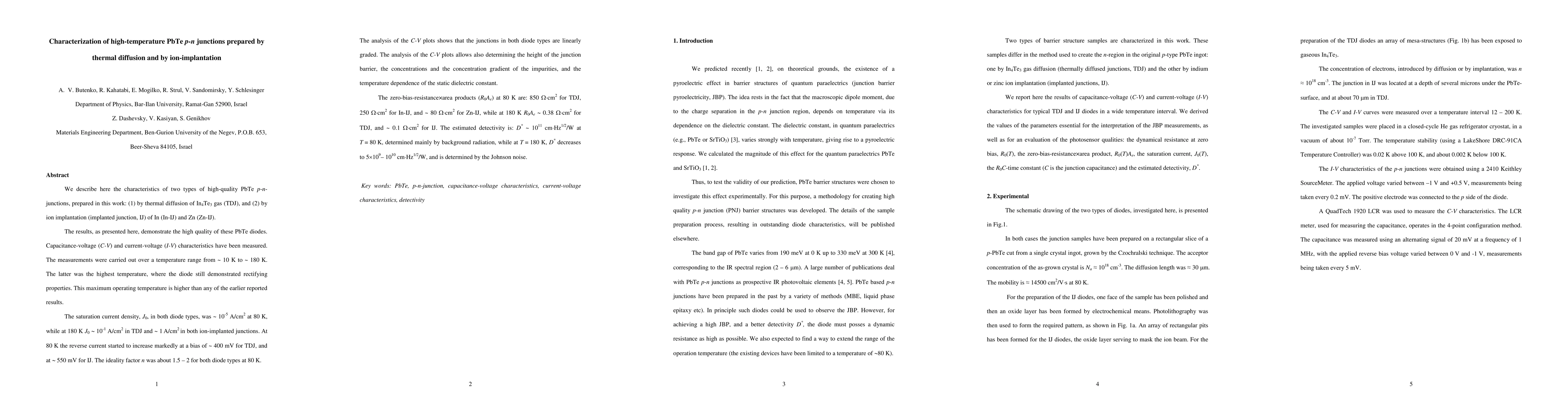 The paper details the creation and characterization of high-quality PbTe p-n junctions using thermal diffusion and ion implantation methods. These diodes exhibit high operating temperatures, reaching up to 180K while still demonstrating rectifying properties. The study measures capacitance-voltage and current-voltage characteristics across a temperature range of 10K to 180K, finding that saturation current density varies significantly with temperature. Zero-bias-resistance x area products (R0Ae) are also reported for different temperatures and junction types.