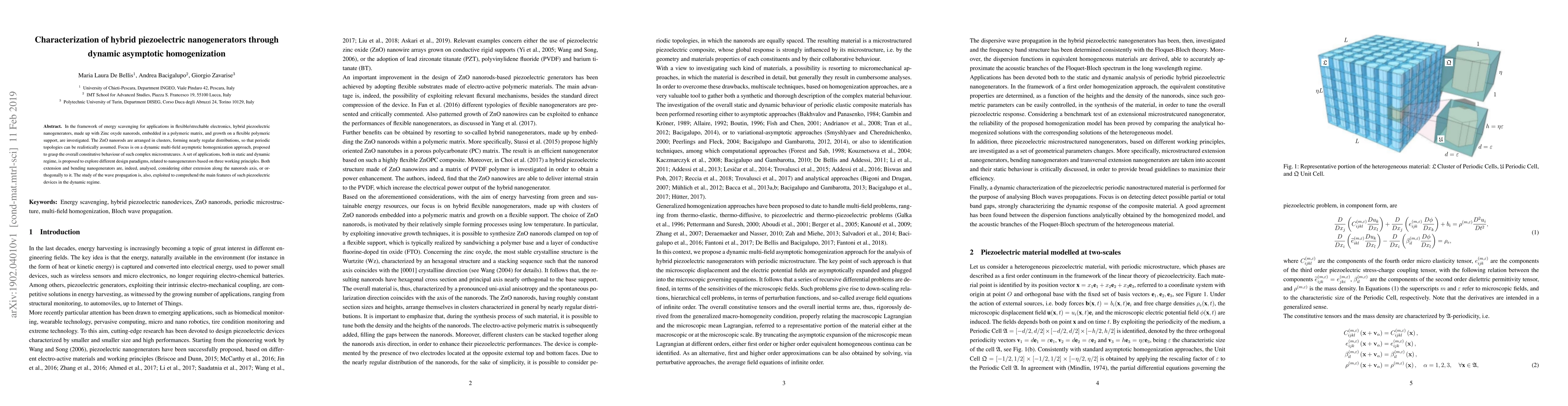 In the framework of energy scavenging for applications in flexible/strechable electronics, hybrid piezoelectric nanogenerators, made up with Zinc oxyde nanorods, embedded in a polymeric matrix, and growth on a flexible polymeric support, are investigated. The ZnO nanorods are arranged in clusters, forming nearly regular distributions, so that periodic topologies can be realistically assumed. Focus is on a dynamic multi-field asymptotic homogenization approach, proposed to grasp the overall constitutive behaviour of such complex microstrutcures. A set of applications, both in static and dynamic regime, is proposed to explore different design paradigms, related to nanogenerators based on three working principles. Both extension and bending nanogenerators are, indeed, analysed, considering either extension along the nanorods axis, or orthogonally to it. The study of the wave propagation is, also, exploited to comprehend the main features of such piezoelectric devices in the dynamic regime.