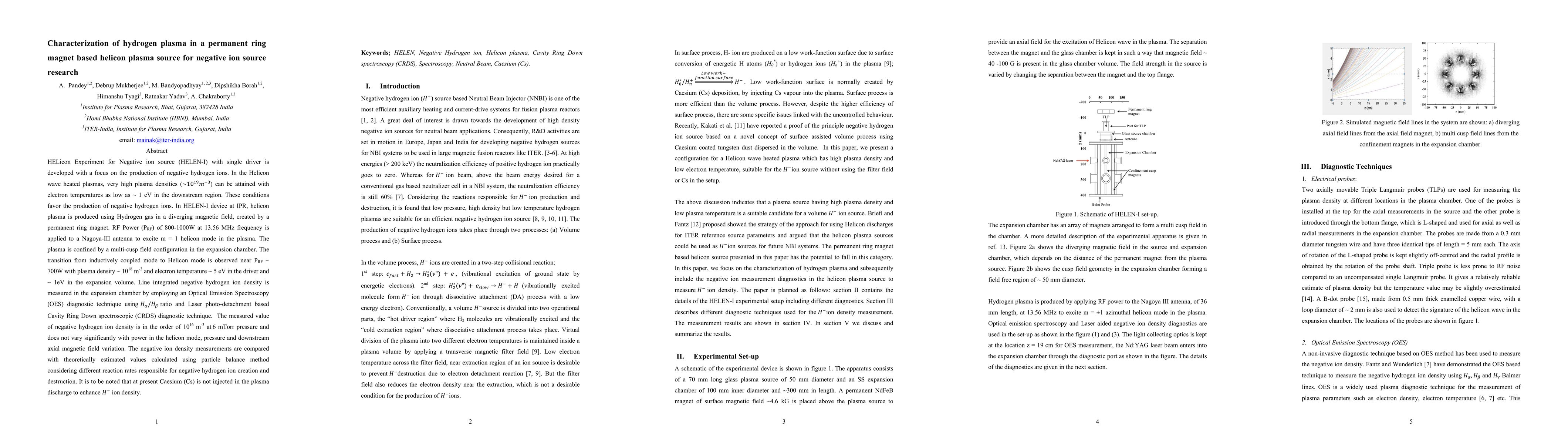 This paper characterizes hydrogen plasma in a permanent ring magnet-based Helicon plasma source (HELEN-I) designed for producing negative hydrogen ions. The device achieves high plasma densities and low electron temperatures, favoring negative ion production, with measured negative hydrogen ion density around $10^{16} m^{-3}$ at 6 mTorr pressure, using Optical Emission Spectroscopy and Laser photo-detachment based Cavity Ring Down spectroscopy.