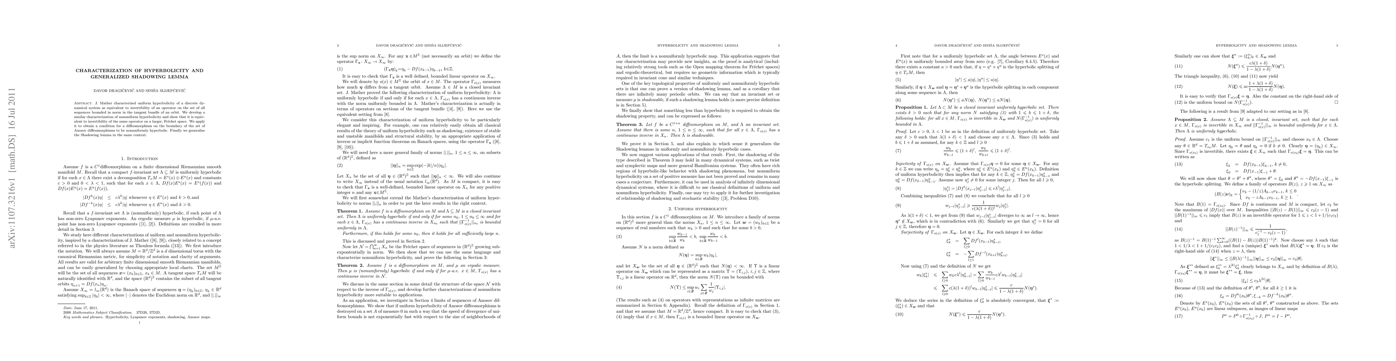 J. Mather characterized uniform hyperbolicity of a discrete dynamical system as equivalent to invertibility of an operator on the set of all sequences bounded in norm in the tangent bundle of an orbit. We develop a similar characterization of nonuniform hyperbolicity and show that it is equivalent to invertibility of the same operator on a larger, Fr\'echet space. We apply it to obtain a condition for a diffeomorphism on the boundary of the set of Anosov diffeomorphisms to be nonuniformly hyperbolic. Finally we generalise the Shadowing lemma in the same context.