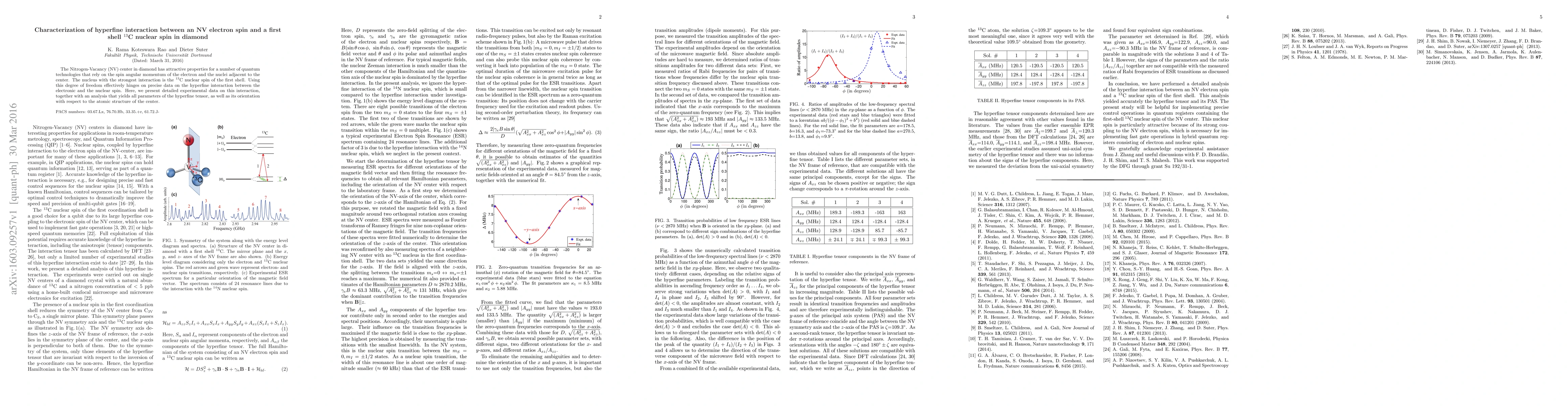 This paper characterizes the hyperfine interaction between an NV electron spin and a first-shell $^{13}$C nuclear spin in diamond, providing detailed experimental data and analysis to determine the hyperfine tensor parameters and their orientation relative to the atomic structure. This information is crucial for leveraging NV centers in quantum technologies.