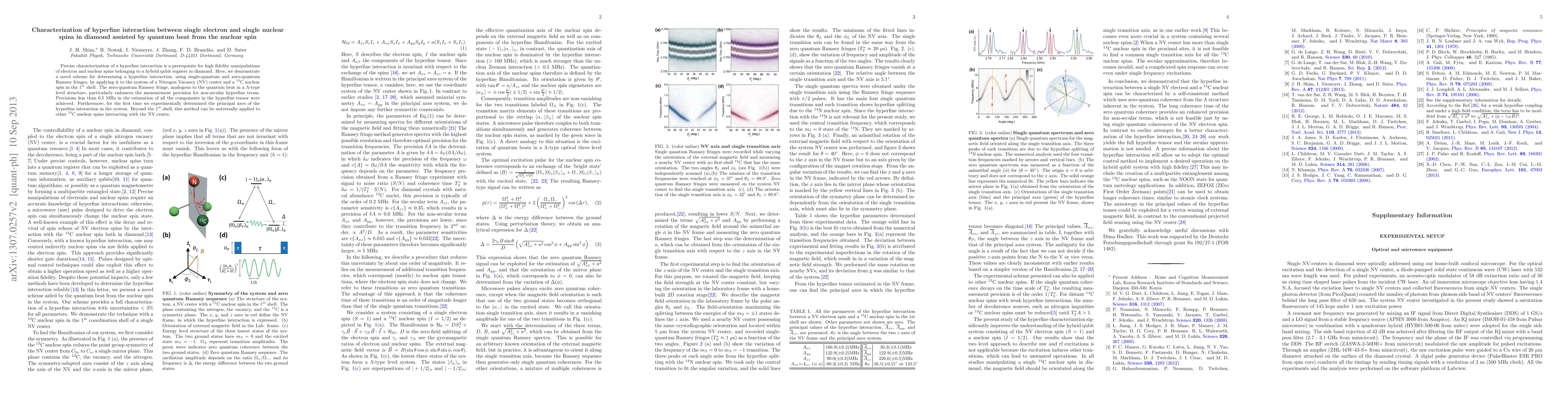 This paper presents a novel method for characterizing hyperfine interactions in diamond using single-quantum and zero-quantum Ramsey fringes, achieving precisions below 0.5 MHz for a NV center and a $^{13}$C nuclear spin. It also determines the principal axes of the hyperfine interaction for the first time.