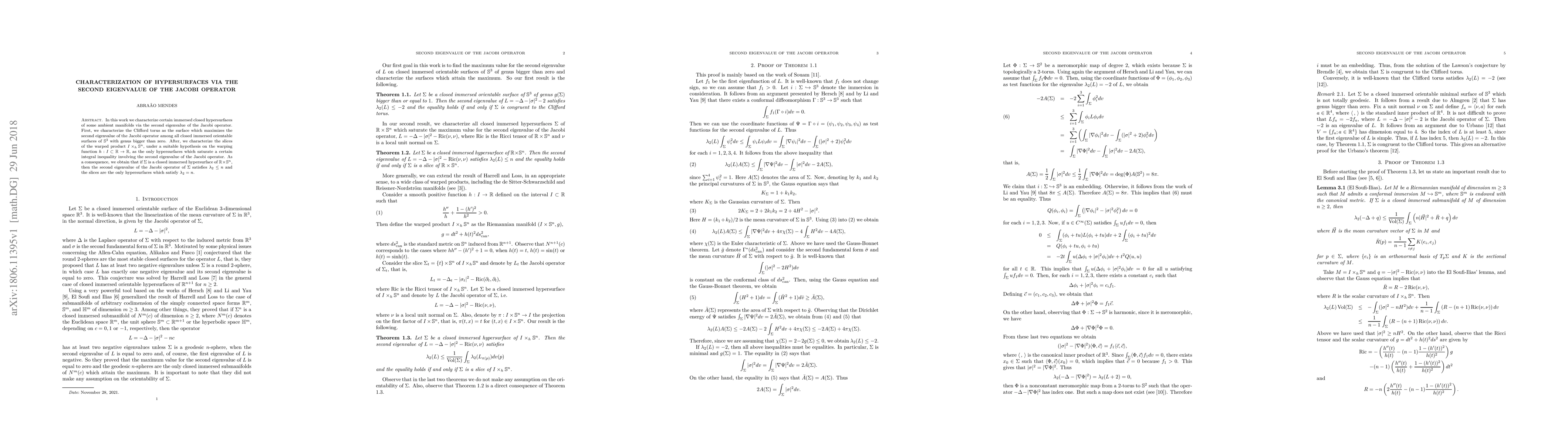 This paper characterizes specific immersed closed hypersurfaces in ambient manifolds using the second eigenvalue of the Jacobi operator. It identifies the Clifford torus as the surface maximizing this eigenvalue in $\mathbb S^3$ and proves that slices of the warped product $I\times_h\mathbb S^n$ saturate a certain integral inequality, with the second eigenvalue of the Jacobi operator constrained by $\lambda_2\le n$.