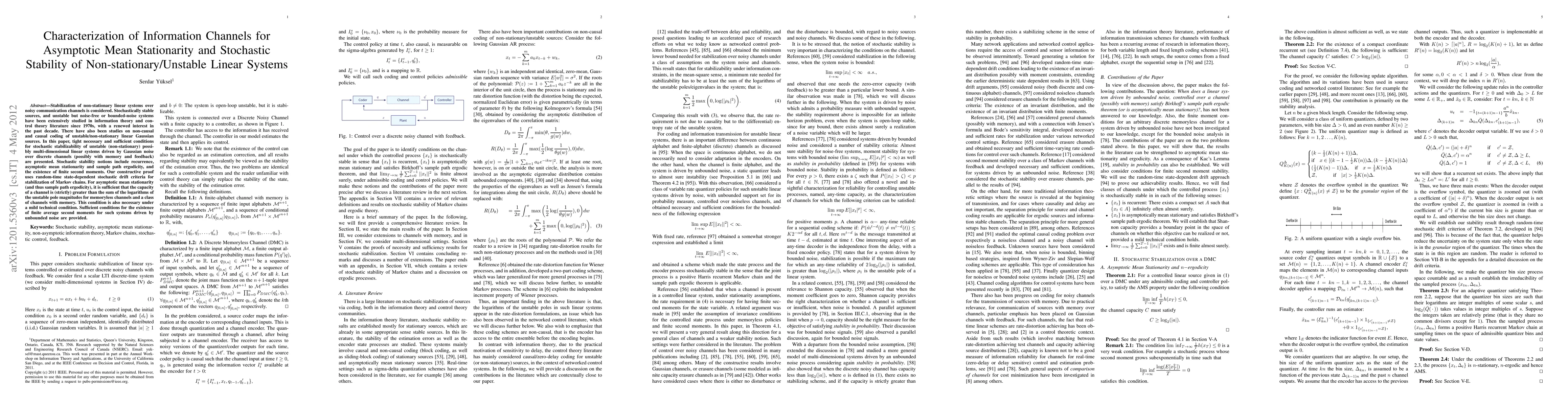 Stabilization of non-stationary linear systems over noisy communication channels is considered. Stochastically stable sources, and unstable but noise-free or bounded-noise systems have been extensively studied in information theory and control theory literature since 1970s, with a renewed interest in the past decade. There have also been studies on non-causal and causal coding of unstable/non-stationary linear Gaussian sources. In this paper, tight necessary and sufficient conditions for stochastic stabilizability of unstable (non-stationary) possibly multi-dimensional linear systems driven by Gaussian noise over discrete channels (possibly with memory and feedback) are presented. Stochastic stability notions include recurrence, asymptotic mean stationarity and sample path ergodicity, and the existence of finite second moments. Our constructive proof uses random-time state-dependent stochastic drift criteria for stabilization of Markov chains. For asymptotic mean stationarity (and thus sample path ergodicity), it is sufficient that the capacity of a channel is (strictly) greater than the sum of the logarithms of the unstable pole magnitudes for memoryless channels and a class of channels with memory. This condition is also necessary under a mild technical condition. Sufficient conditions for the existence of finite average second moments for such systems driven by unbounded noise are provided.