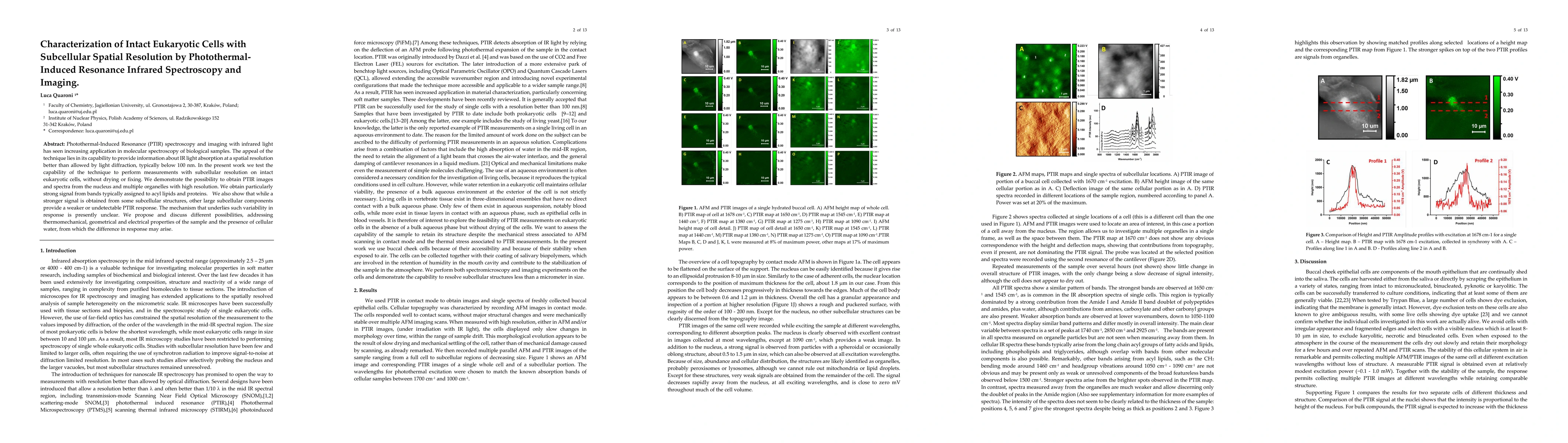 This paper demonstrates the use of Photothermal-Induced Resonance (PTIR) spectroscopy and imaging to achieve subcellular spatial resolution in intact eukaryotic cells, revealing detailed IR absorption spectra from organelles like the nucleus. The study highlights variability in PTIR response among different subcellular components, proposing potential underlying mechanisms.