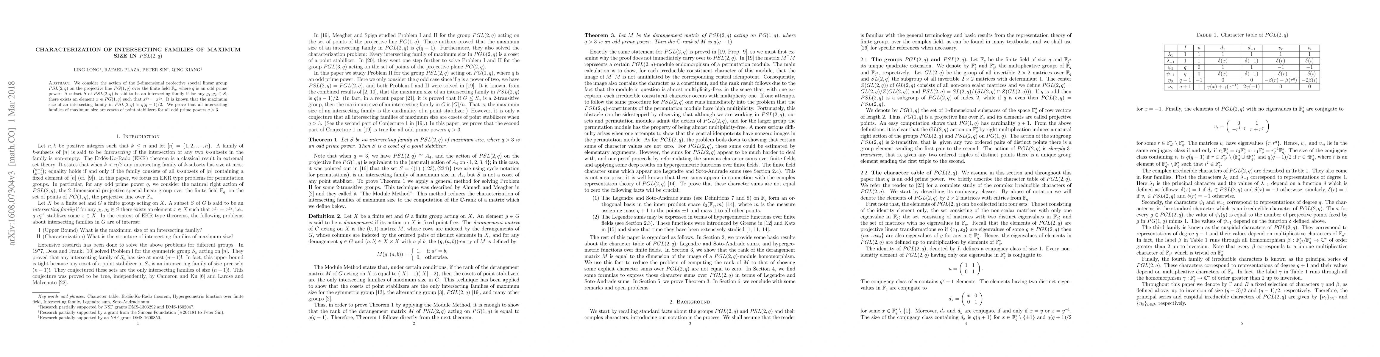We consider the action of the $2$-dimensional projective special linear group $PSL(2,q)$ on the projective line $PG(1,q)$ over the finite field $\F_q$, where $q$ is an odd prime power. A subset $S$ of $PSL(2,q)$ is said to be an intersecting family if for any $g_1,g_2 \in S$, there exists an element $x\in PG(1,q)$ such that $x^{g_1}= x^{g_2}$. It is known that the maximum size of an intersecting family in $PSL(2,q)$ is $q(q-1)/2$. We prove that all intersecting families of maximum size are cosets of point stabilizers for all odd prime powers $q>3$.