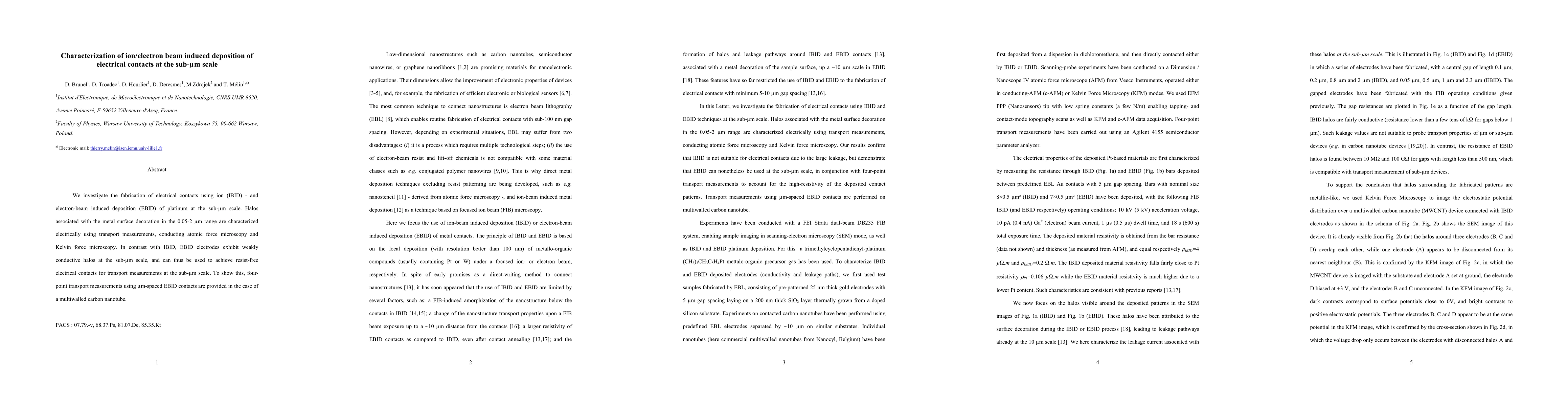 The paper explores the use of ion- and electron-beam induced deposition for creating sub-micron electrical contacts using platinum. It finds that electron-beam induced deposition (EBID) results in weakly conductive halos suitable for resist-free contacts at the sub-micron scale, while ion-beam induced deposition (IBID) does not. This method is demonstrated through transport measurements and atomic force microscopy on a multiwalled carbon nanotube with micron-spaced EBID contacts.