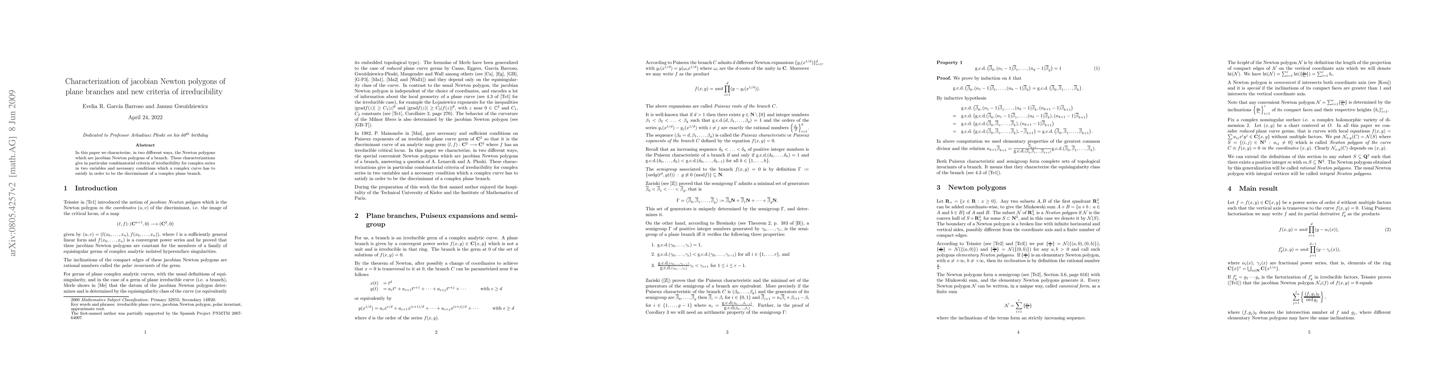 This paper characterizes Jacobian Newton polygons of plane branches through two distinct methods, providing combinatorial irreducibility criteria for complex series in two variables and necessary conditions for a complex curve to serve as the discriminant of a plane branch.
