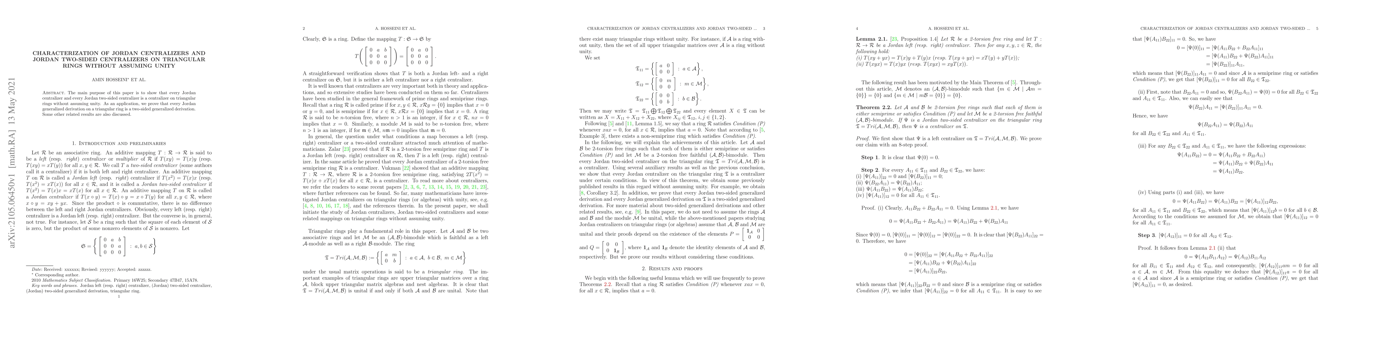 This paper characterizes Jordan centralizers and Jordan two-sided centralizers on triangular rings without requiring unity, proving that they are centralizers. It also demonstrates that every Jordan generalized derivation on such a ring is a two-sided generalized derivation.
