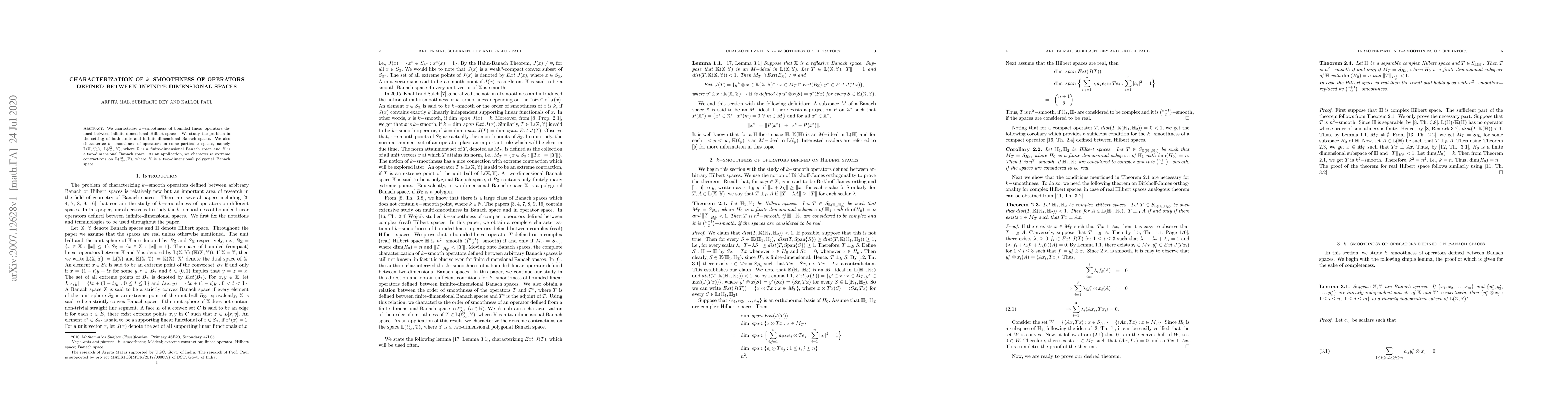 We characterize $k-$smoothness of bounded linear operators defined between infinite-dimensional Hilbert spaces. We study the problem in the setting of both finite and infinite-dimensional Banach spaces. We also characterize $k-$smoothness of operators on some particular spaces, namely $\mathbb{L}(\mathbb{X},\ell_{\infty}^n),~\mathbb{L}(\ell_{\infty}^3,\mathbb{Y}),$ where $\mathbb{X}$ is a finite-dimensional Banach space and $\mathbb{Y}$ is a two-dimensional Banach space. As an application, we characterize extreme contractions on $\mathbb{L}(\ell_{\infty}^3,\mathbb{Y}),$ where $\mathbb{Y}$ is a two-dimensional polygonal Banach space.