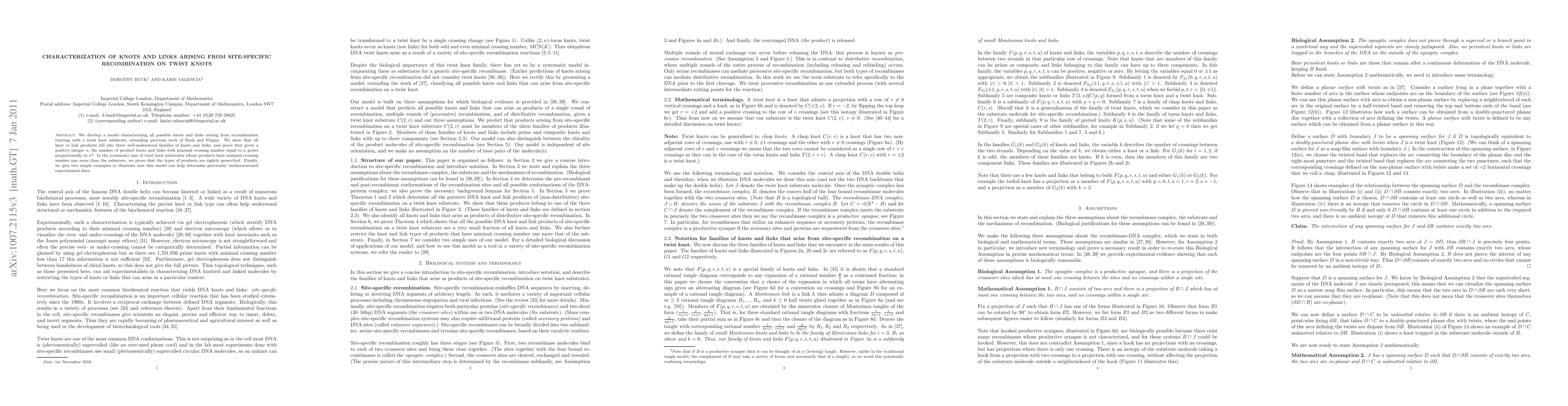 A model characterizes knots and links from site-specific recombination on twist knot substrates, revealing three well-understood families of knots and links with growing numbers proportional to the crossing number.