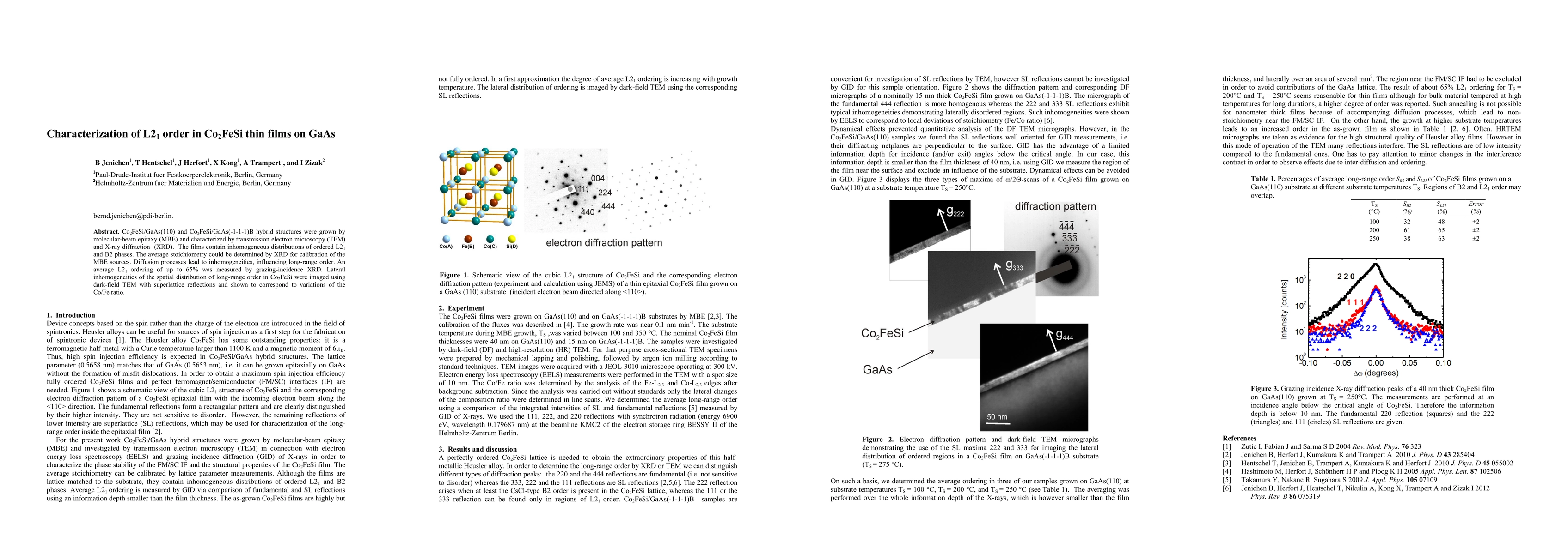 Co2FeSi/GaAs(110) and Co2FeSi/GaAs(-1-1-1)B hybrid structures were grown by molecular-beam epitaxy (MBE) and characterized by transmission electron microscopy (TEM) and X-ray diffraction (XRD). The films contain inhomogeneous distributions of ordered L21 and B2 phases. The average stoichiometry could be determined by XRD for calibration of the MBE sources. Diffusion processes lead to inhomogeneities, influencing long-range order. An average L21 ordering of up to 65% was measured by grazing-incidence XRD. Lateral inhomogeneities of the spatial distribution of long-range order in Co2FeSi were imaged using dark-field TEM with superlattice reflections and shown to correspond to variations of the Co/Fe ratio.