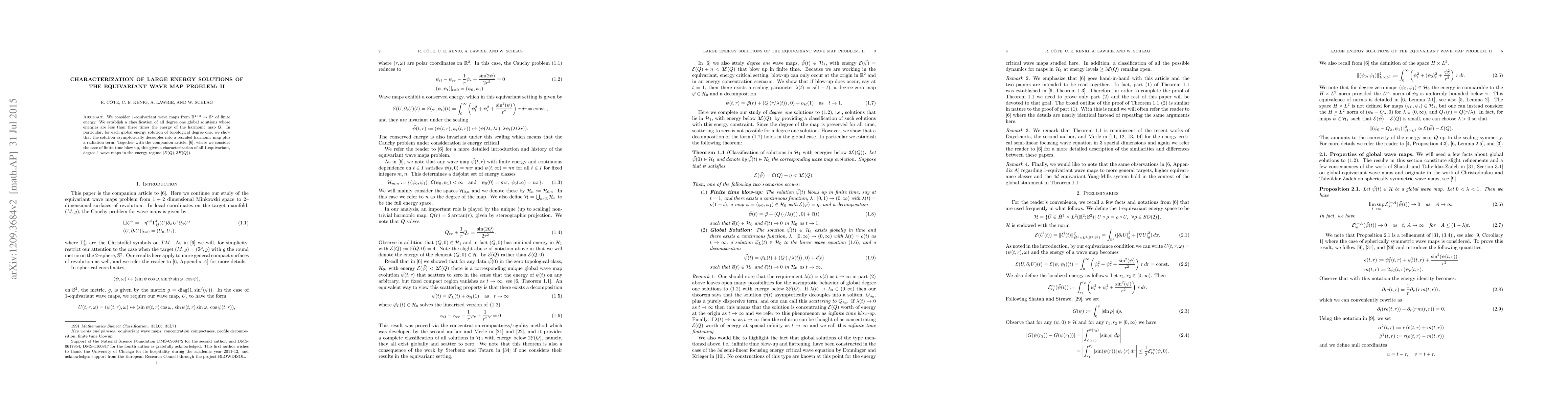 We consider 1-equivariant wave maps from 1+2 dimensions to the 2-sphere of finite energy. We establish a classification of all degree 1 global solutions whose energies are less than three times the energy of the harmonic map Q. In particular, for each global energy solution of topological degree 1, we show that the solution asymptotically decouples into a rescaled harmonic map plus a radiation term. Together with our companion article, where we consider the case of finite-time blow up, this gives a characterization of all 1-equivariant, degree 1 wave maps in the energy regime [E(Q), 3E(Q)).