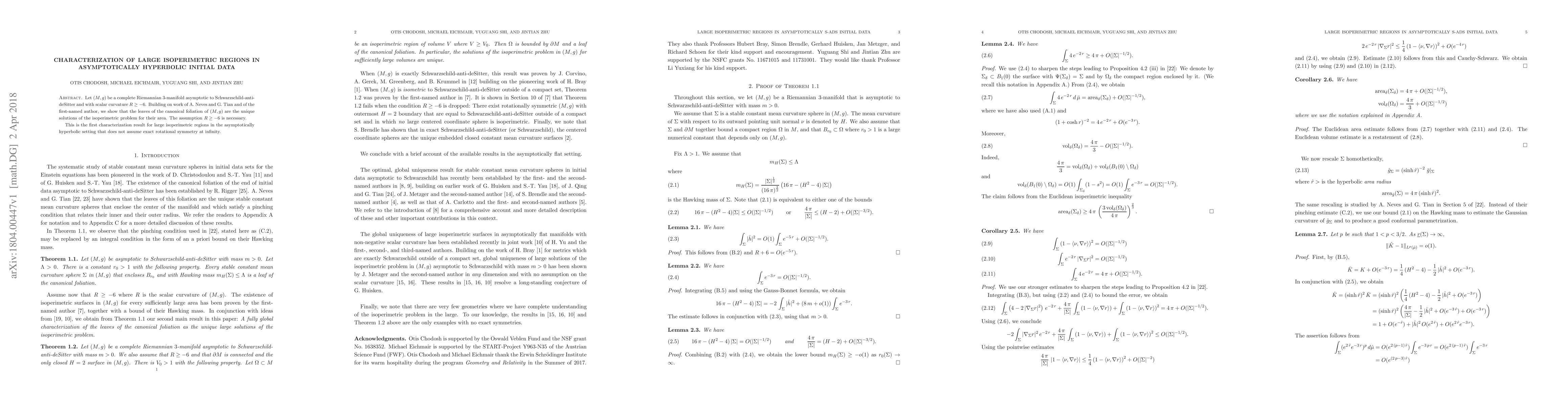 This paper characterizes large isoperimetric regions in asymptotically hyperbolic initial data, proving that the leaves of the canonical foliation are the unique solutions to the isoperimetric problem for their area, without assuming exact rotational symmetry at infinity. The necessity of the scalar curvature condition $R \geq -6$ is also established.