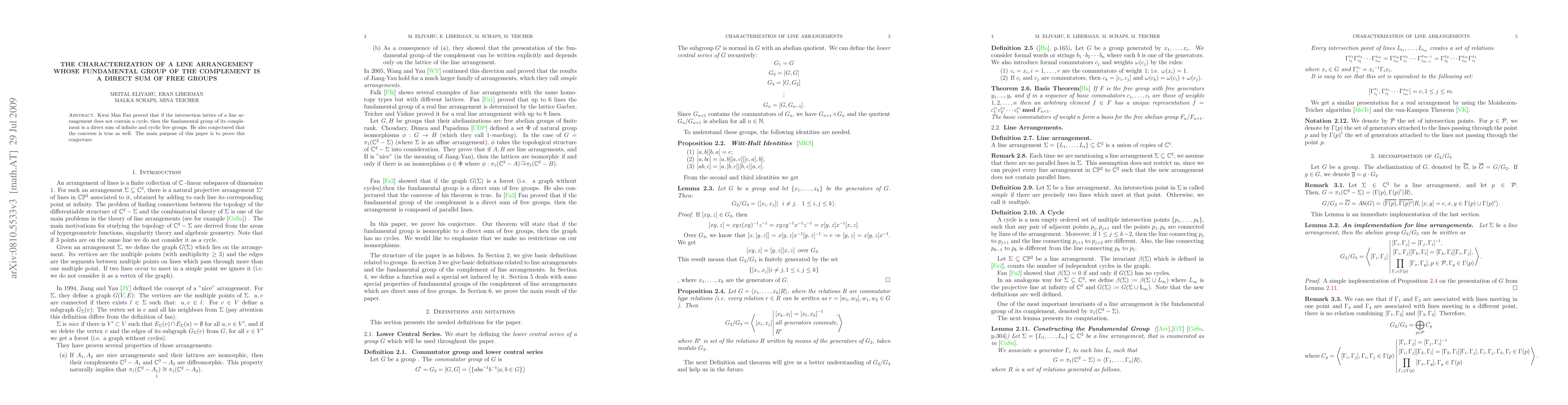 Kwai Man Fan proved that if the intersection lattice of a line arrangement does not contain a cycle, then the fundamental group of its complement is a direct sum of infinite and cyclic free groups. He also conjectured that the converse is true as well. The main purpose of this paper is to prove this conjecture