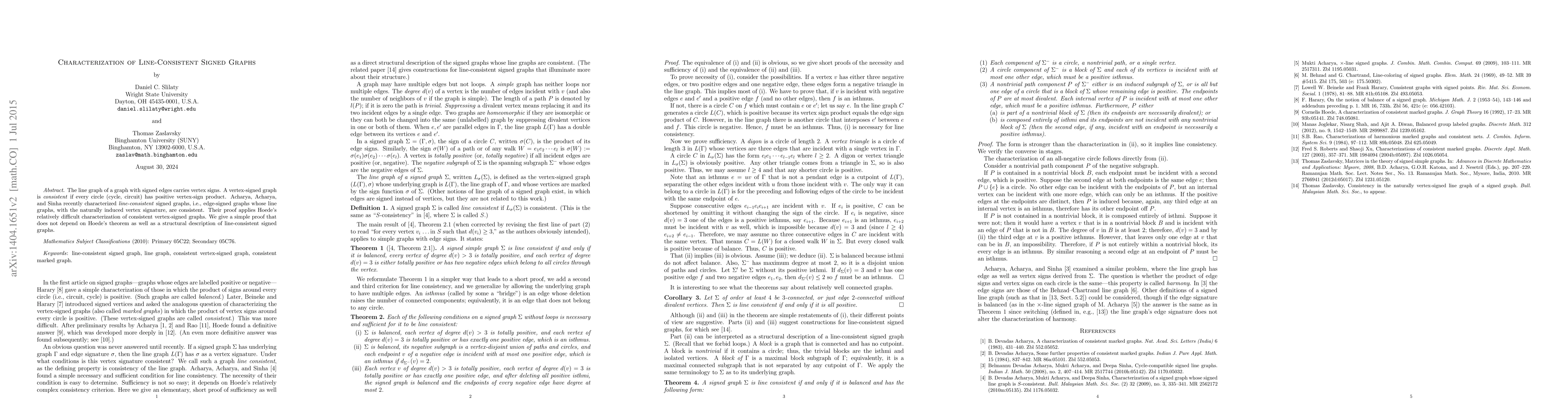 The main technical contribution is a characterization of line consistency in signed graphs, which provides a new understanding of these graphs.