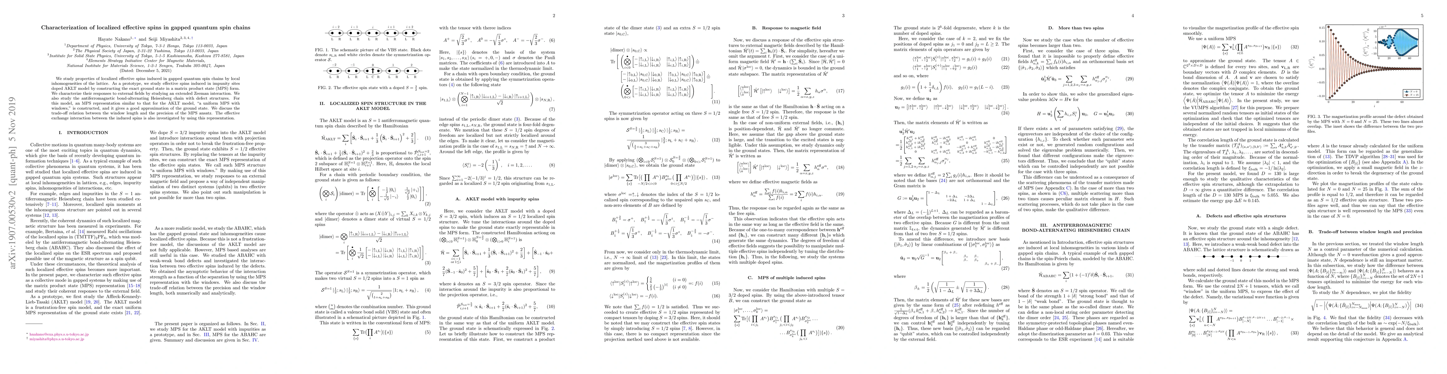 We study properties of localized effective spins induced in gapped quantum spin chains by local inhomogeneities of the lattice. As a prototype, we study effective spins induced in impunity sites doped AKLT model by constructing the exact ground state in a matrix product state (MPS) form. We characterize their responses to external fields by studying an extended Zeeman interaction. We also study the antiferromagnetic bond-alternating Heisenberg chain with defect structures. For this model, an MPS representation similar to that for the AKLT model, "a uniform MPS with windows", is constructed, and it gives a good approximation of the ground state. We discuss the trade-off relation between the window length and the precision of the MPS ansatz. The effective exchange interaction between the induced spins is also investigated by using this representation.