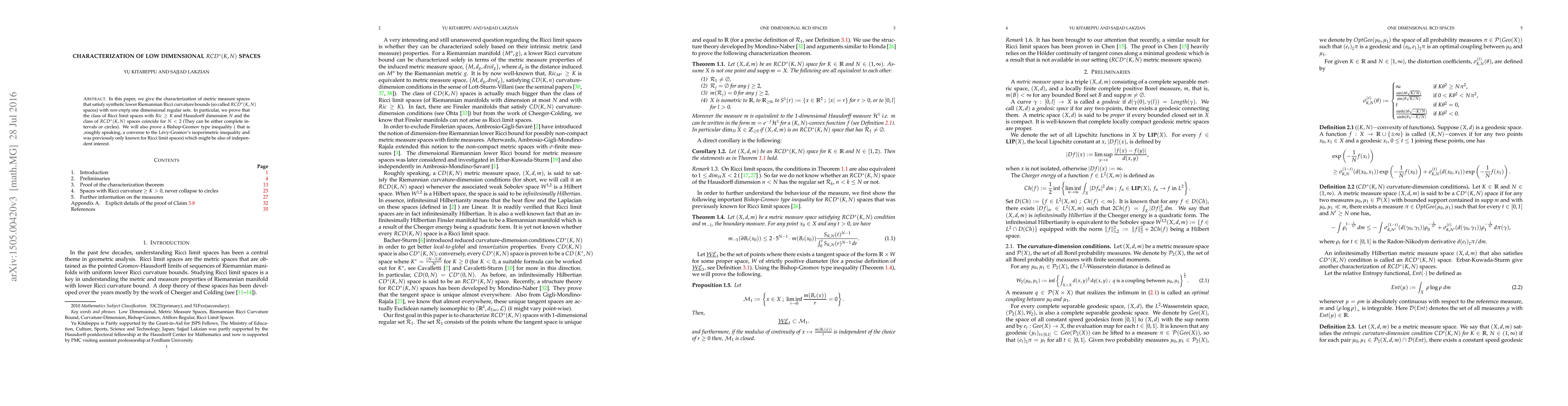 In this paper, we give the characterization of metric measure spaces that satisfy synthetic lower Riemannian Ricci curvature bounds (so called $RCD^*(K,N)$ spaces) with \emph{non-empty} one dimensional regular sets. In particular, we prove that the class of Ricci limit spaces with $Ric \ge K$ and Hausdorff dimension $N$ and the class of $RCD^*(K,N)$ spaces coincide for $N < 2$ (They can be either complete intervals or circles). We will also prove a Bishop-Gromov type inequality ( that is ,roughly speaking, a converse to the L\'{e}vy-Gromov's isoperimetric inequality and was previously only known for Ricci limit spaces) which might be also of independent interest.