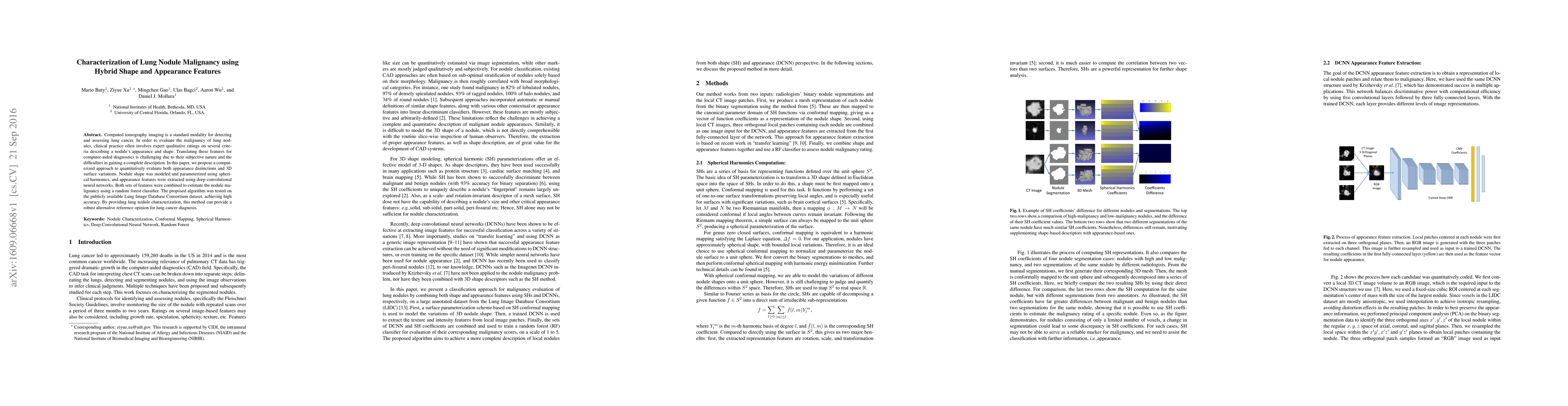 This paper proposes a computerized method to evaluate lung nodule malignancy using hybrid shape and appearance features, combining spherical harmonics for shape modeling and deep convolutional neural networks for appearance features, which are then classified using a random forest classifier. The method shows high accuracy on the Lung Image Database Consortium dataset, offering a robust alternative for lung cancer diagnosis.