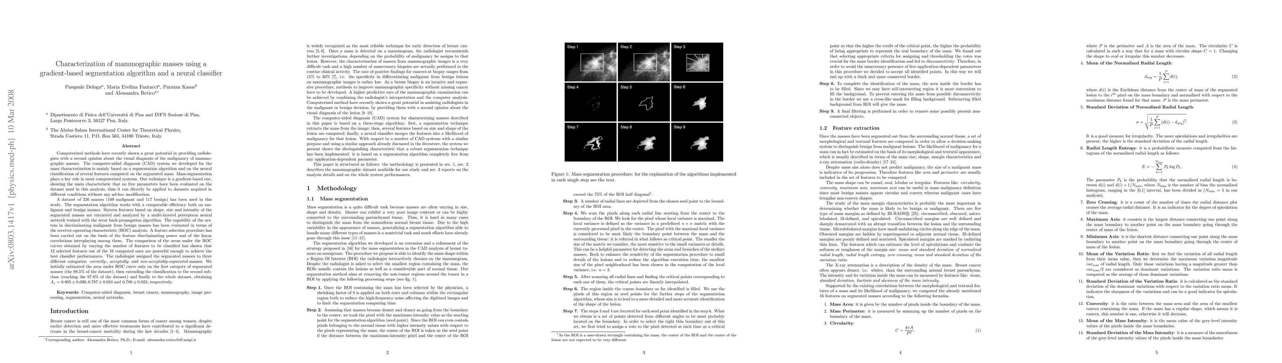 The computer-aided diagnosis system we developed for the mass characterization is mainly based on a segmentation algorithm and on the neural classification of several features computed on the segmented mass. Mass segmentation plays a key role in most computerized systems. Our technique is a gradient-based one, showing the main characteristic that no free parameters have been evaluated on the dataset used in this analysis, thus it can directly be applied to datasets acquired in different conditions without any ad-hoc modification. A dataset of 226 masses (109 malignant and 117 benign) has been used in this study. The segmentation algorithm works with a comparable efficiency both on malignant and benign masses. Sixteen features based on shape, size and intensity of the segmented masses are analyzed by a multi-layered perceptron neural network. A feature selection procedure has been carried out on the basis of the feature discriminating power and of the linear correlations interplaying among them. The comparison of the areas under the ROC curves obtained by varying the number of features to be classified has shown that 12 selected features out of the 16 computed ones are powerful enough to achieve the best classifier performances. The radiologist assigned the segmented masses to three different categories: correctly-, acceptably- and non-acceptably-segmented masses. We initially estimated the area under ROC curve only on the first category of segmented masses (the 88.5% of the dataset), then extending the dataset to the second sub-class (reaching the 97.8% of the dataset) and finally to the whole dataset, obtaining Az = 0.805+-0.030, 0.787+-0.024 and 0.780+-0.023, respectively.