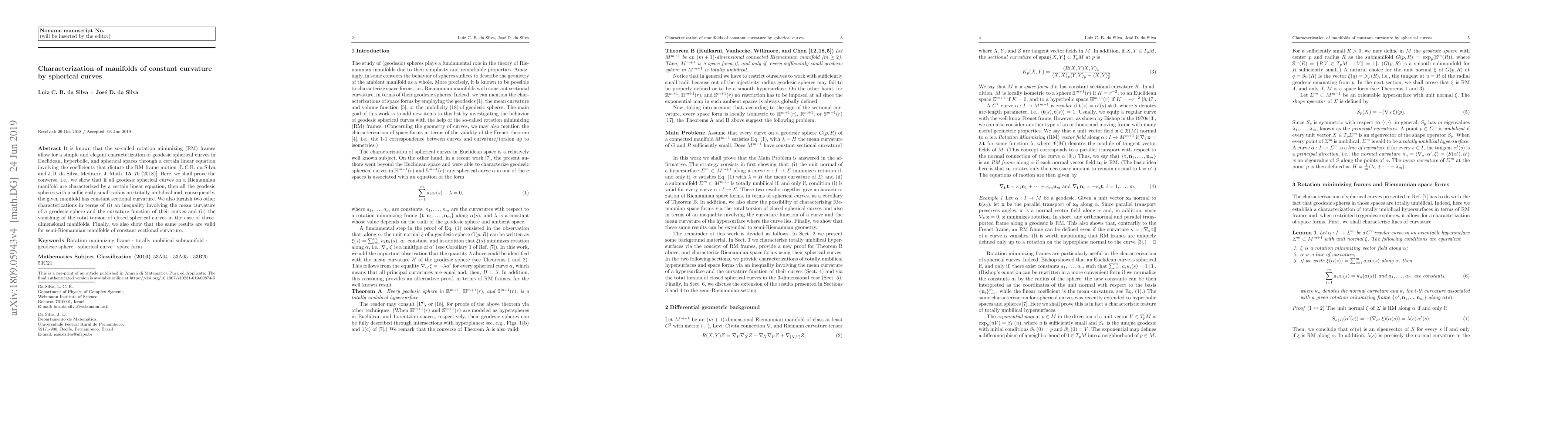 It is known that the so-called rotation minimizing (RM) frames allow for a simple and elegant characterization of geodesic spherical curves in Euclidean, hyperbolic, and spherical spaces through a certain linear equation involving the coefficients that dictate the RM frame motion (da Silva, da Silva in Mediterr J Math 15:70, 2018). Here, we shall prove the converse, i.e., we show that if all geodesic spherical curves on a Riemannian manifold are characterized by a certain linear equation, then all the geodesic spheres with a sufficiently small radius are totally umbilical and, consequently, the given manifold has constant sectional curvature. We also furnish two other characterizations in terms of (i) an inequality involving the mean curvature of a geodesic sphere and the curvature function of their curves and (ii) the vanishing of the total torsion of closed spherical curves in the case of three-dimensional manifolds. Finally, we also show that the same results are valid for semi-Riemannian manifolds of constant sectional curvature.