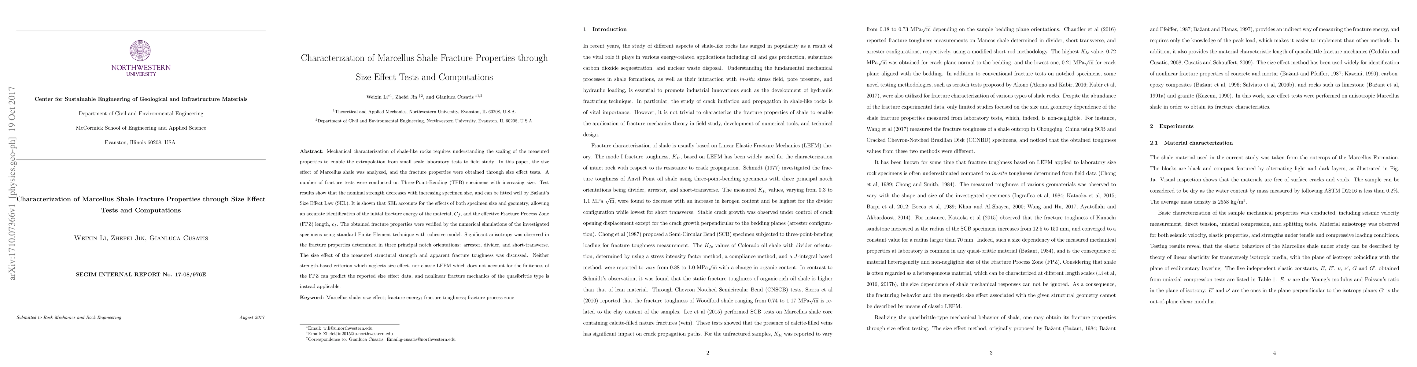 This paper investigates the size effect on fracture properties of Marcellus shale through laboratory tests and numerical simulations, demonstrating that nominal strength decreases with larger specimen sizes and fits Bazant's Size Effect Law. The study highlights significant anisotropy in fracture properties across different notch orientations and concludes that nonlinear fracture mechanics better predict the observed size effects than traditional criteria.